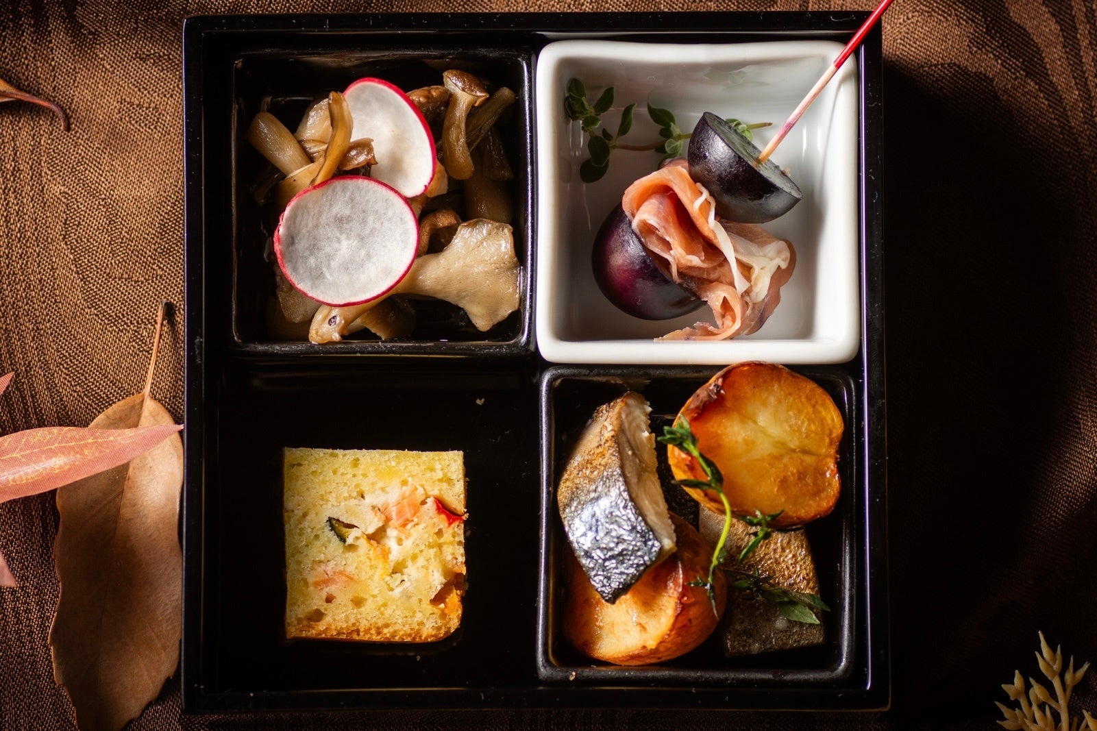 「季節の段」、「枯山水の段」「八坂の塔の段」、2つの「おばんざいの段」からなる五段重は、それぞれテーマに合わせた内容になっています。そのなかでも「季節の段」は旬の食材を使った段で、見た目も秋らしい色合いの「林檎タルトタタン」、「バイオレットマカロン」、一口サイズで口の中に秋が広がる「栗とほうじ茶のモンブラン」、京都らしく抹茶を贅沢に使用した「抹茶の生チョコレート」が宝石箱のように揃います。