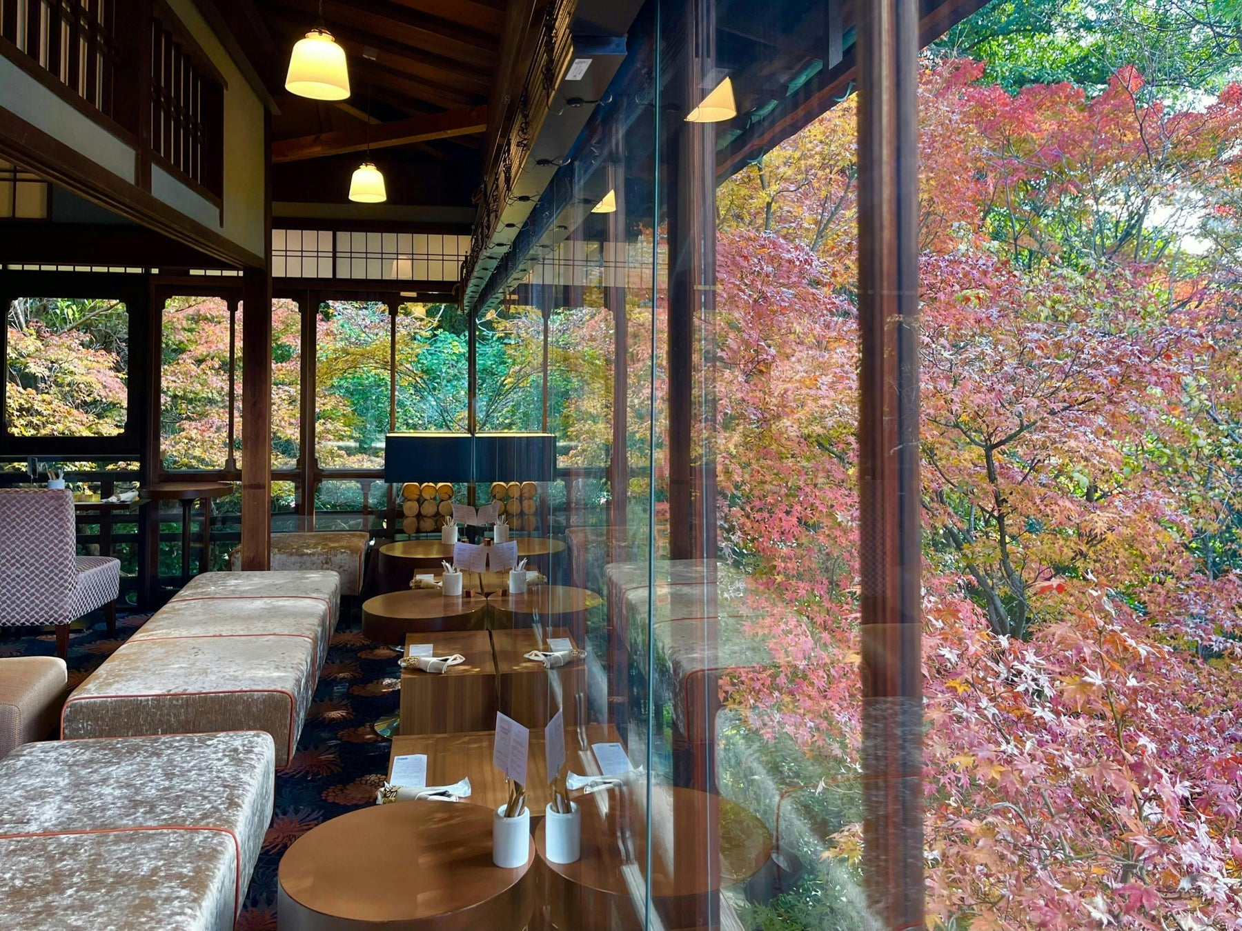 望楼塔の2階より庭を見渡すことができ、紅葉の彩りとともに、都会の喧騒を離れた静けさも感じていただけます。当館のアフタヌーンティーは五重塔(八坂の塔)をイメージして五段重でご提供し、蓋を開けるまで中身がわからないわくわく感と、目に飛び込む和栗や南瓜の彩、林檎の香りが食欲をかき立てます。