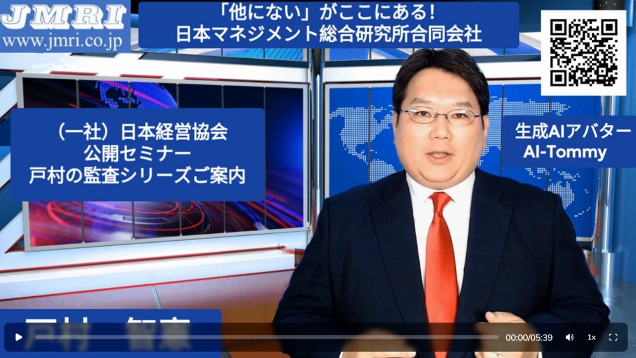 この度、弊社理事長の戸村智憲が(一社)日本経営協会さん主催でお届けする公開セミナーにおきまして、戸村の監査シリーズ「戸村の監査六部作」のご提供開始に際し、下記のとおり、弊社公式の生成AIアバター「AI-Tommy」がお届けするセミナーご紹介AI動画をリリース致しました。