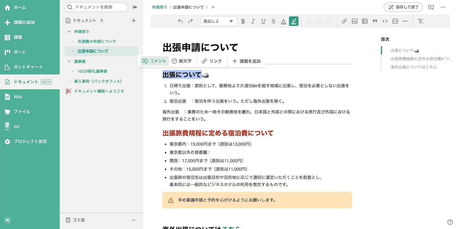 作成した文書はBacklogのプロジェクト配下で管理されるため、タスク管理と文書管理を同じ場所で扱うことができ、情報の散在や引き継ぎの負担を軽減します。