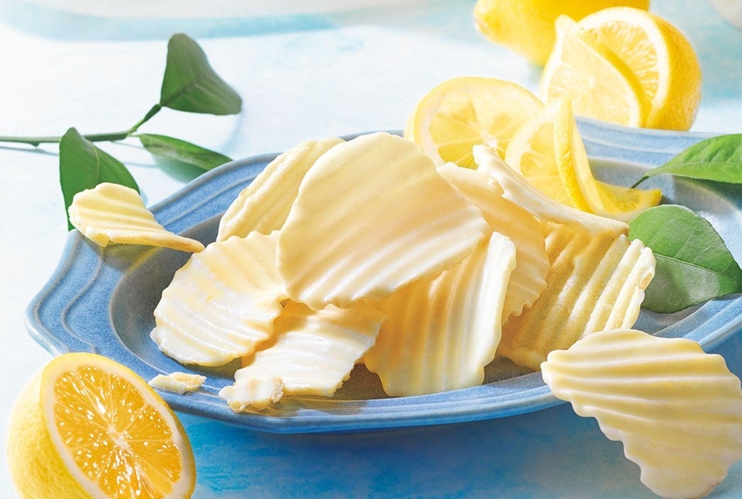 さわやかな酸味が特長のレモンチョコレートをポテトチップの片面にコーティング。レモンの味わいが引き立つよう、レモンチョコレートにはチーズ風味・ヨーグルト風味のチョコレートを隠し味に加えています。レモンのさわやかな香りと酸味、ポテトチップの塩味がひとつになり、塩レモンを思わせる味わいです。