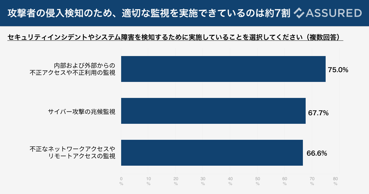 攻撃者からの侵入や侵入された後の行動を検知するための監視を実施しているのは、「内部および外部からの不正アクセスや不正利用の監視(75%)」「サイバー攻撃の兆候監視(67.7%)」「不正なネットワークアクセスやリモートアクセスの監視(66.6%)」と、すべて70%前後の実施率となり、約3分の1で実施できていないことが明らかになりました。