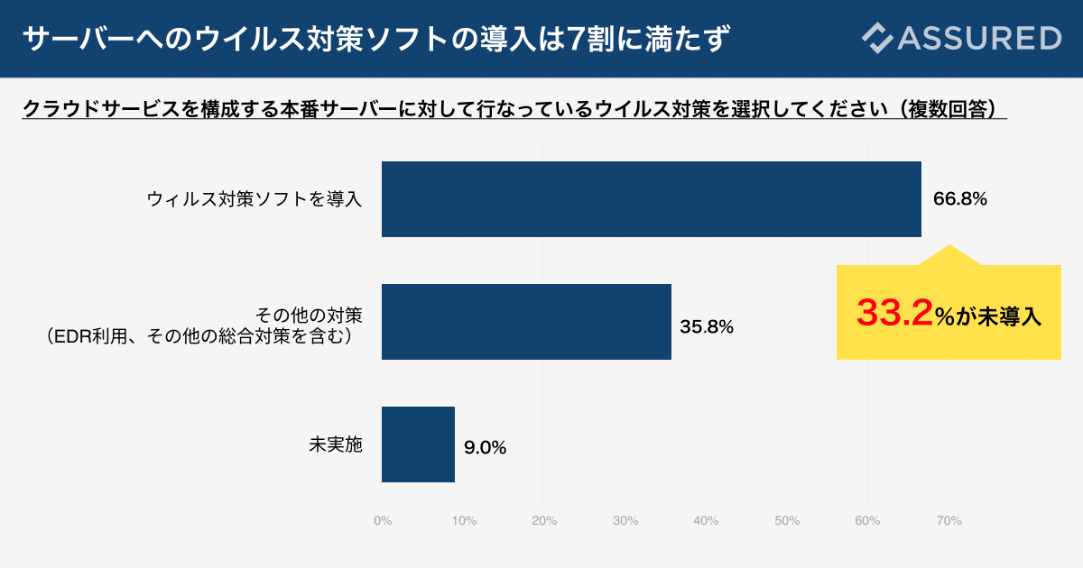 また、サーバーにウイルス対策ソフトを導入し、リアルタイムスキャン、定期的なウイルススキャンやパターンファイルを更新して最新の状態に保つことで、マルウェアやハッキングツール等を利用されるリスクを低減することができますが、33.2%でウイルス対策ソフトが導入がされていませんでした。