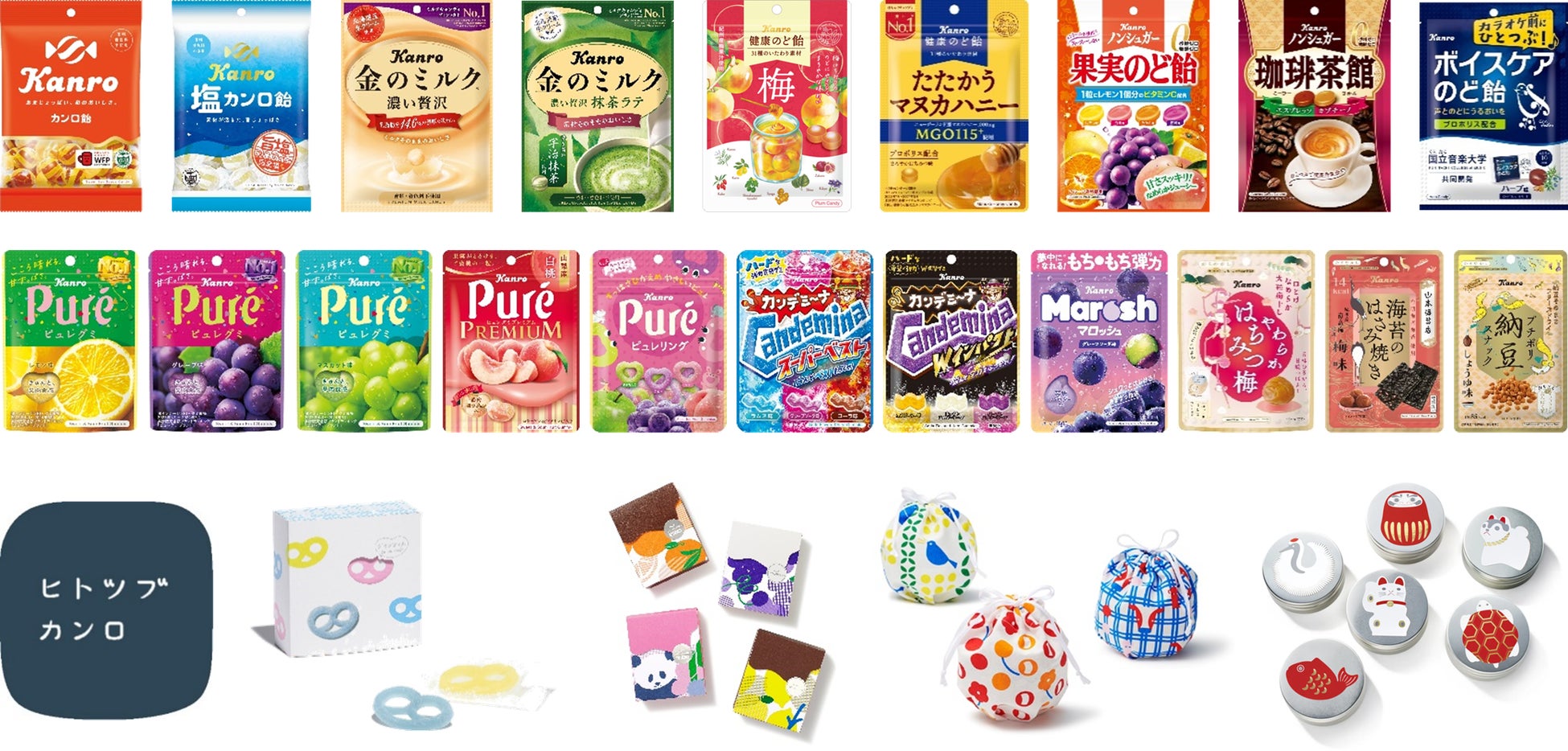 当社は1912年の創業以来、社名になっている「カンロ飴」を始め、菓子食品業界で初ののど飴となる「健康のど飴」、ミルクフレーバーキャンディ市場売上No.1ブランド※1「金のミルク」、大人向けグミの先駆けでありグミの売上トップブランド※2である「ピュレグミ」など、生活者の皆さまから愛される商品を創り続け、成長してまいりました。直営店「ヒトツブカンロ」では、「ヒトからヒトへ つながる ヒトツブ」をコンセプトにキャンディの魅力を発信しております。