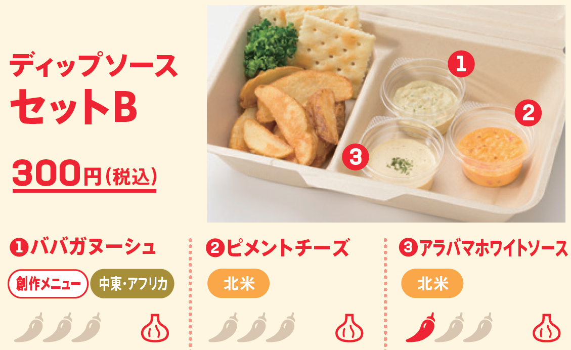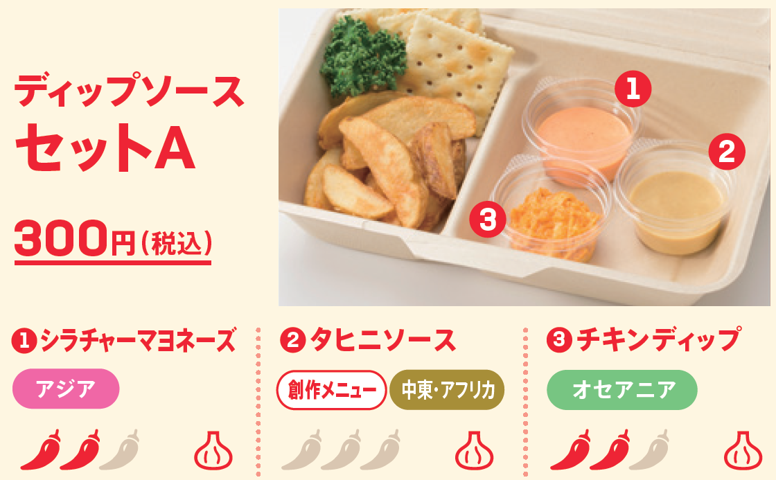 30品には定番メニューのエビマヨやたまごサラダサンドのほか、世界で親しまれているディップソース12品が選ばれています。ディップソースについては、食べ比べを楽しめるよう3種類ずつをセットに、4つのセットメニューとして販売し、会場では計22メニューを販売します※2。キユーピーグループのスタッフ一押しのマヨネーズ料理を、会場でお楽しみください。