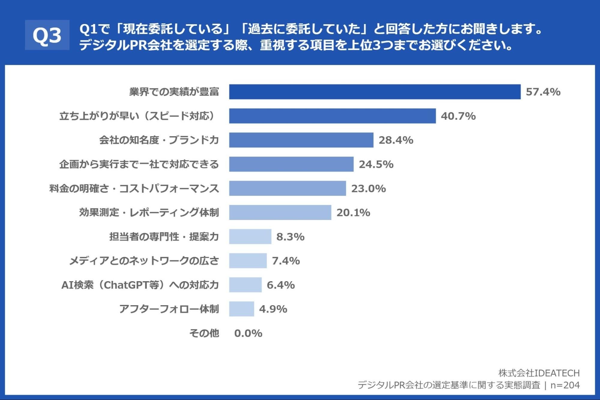 IDEATECH調査(デジタルPR会社選定に関する調査、2025年12月実施、PR委託経験のある広報・マーケティング担当者204名対象)では、選定時の重視項目の第1位は「業界での実績が豊富」で57.4%でした。