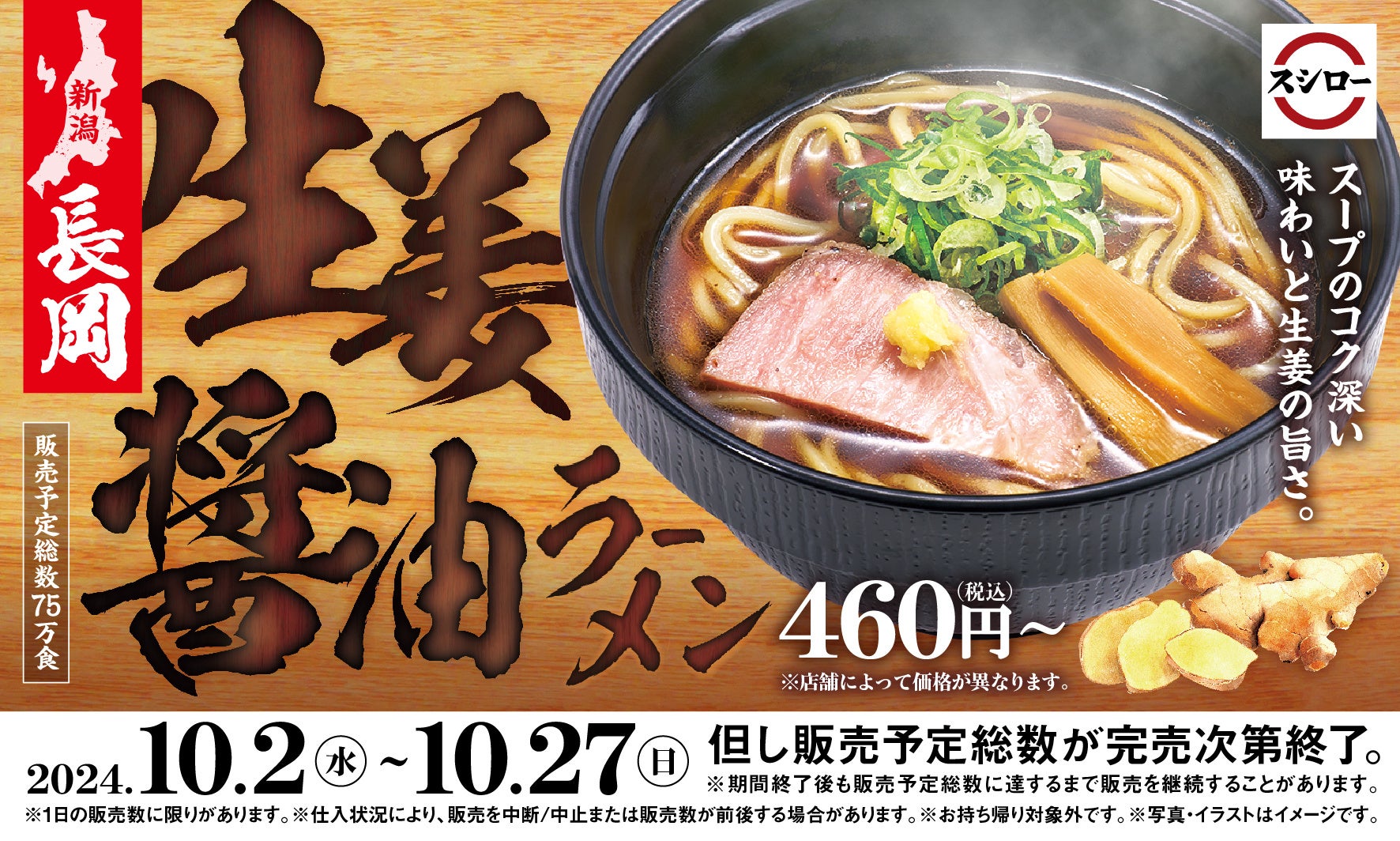 人気の新潟ラーメンがスシローに登場!生姜の風味が香る、キレとコクの至極の一杯「長岡生姜醤油ラーメン」が期間限定で登場!