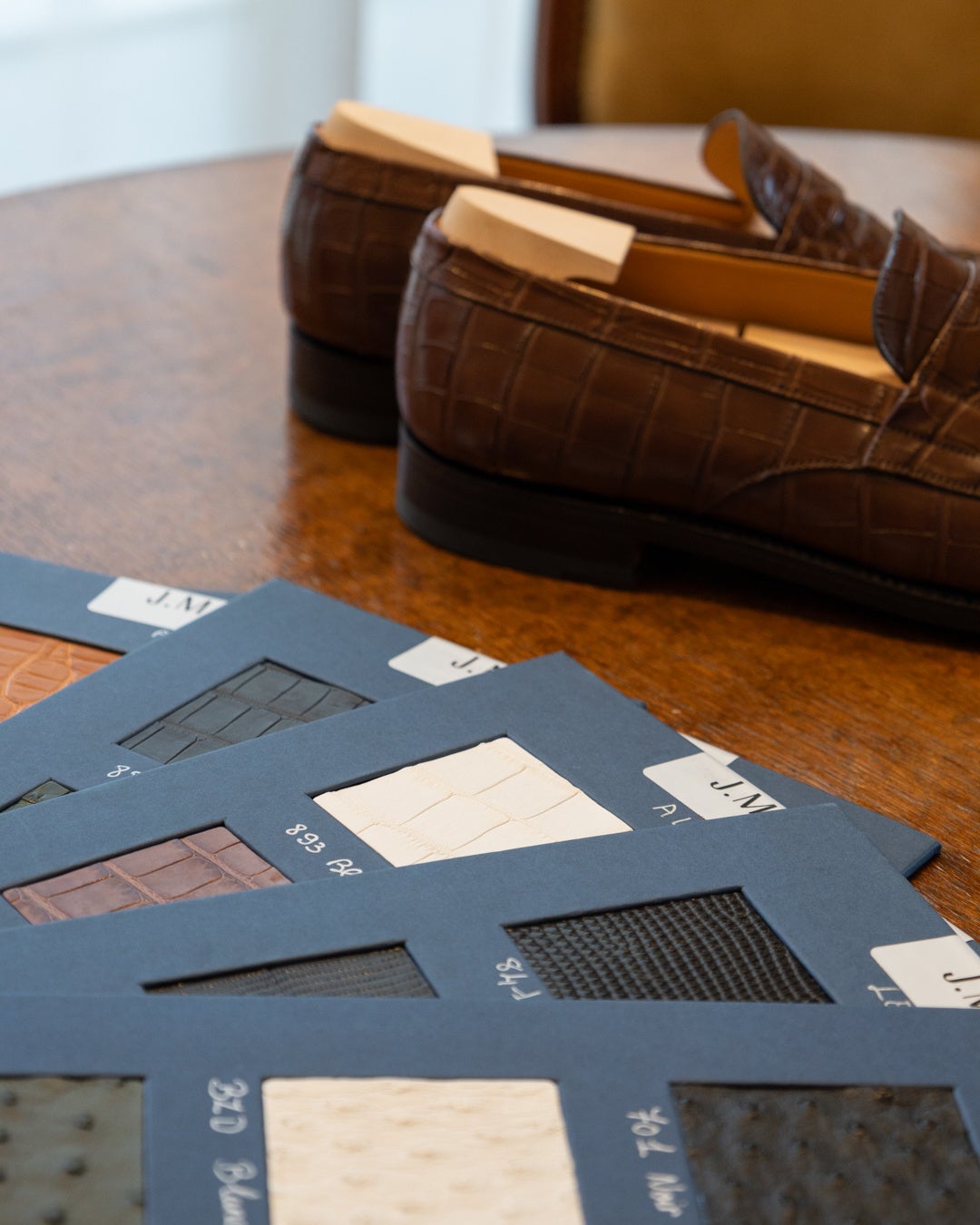 ボックスカーフやスエードなどのクラシカルなものから、リザードやアリゲーターなどの