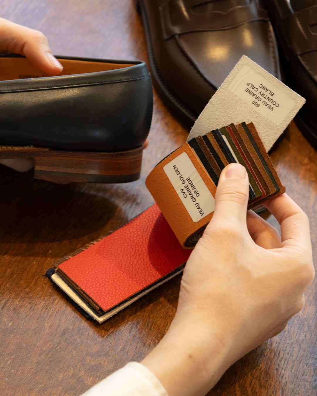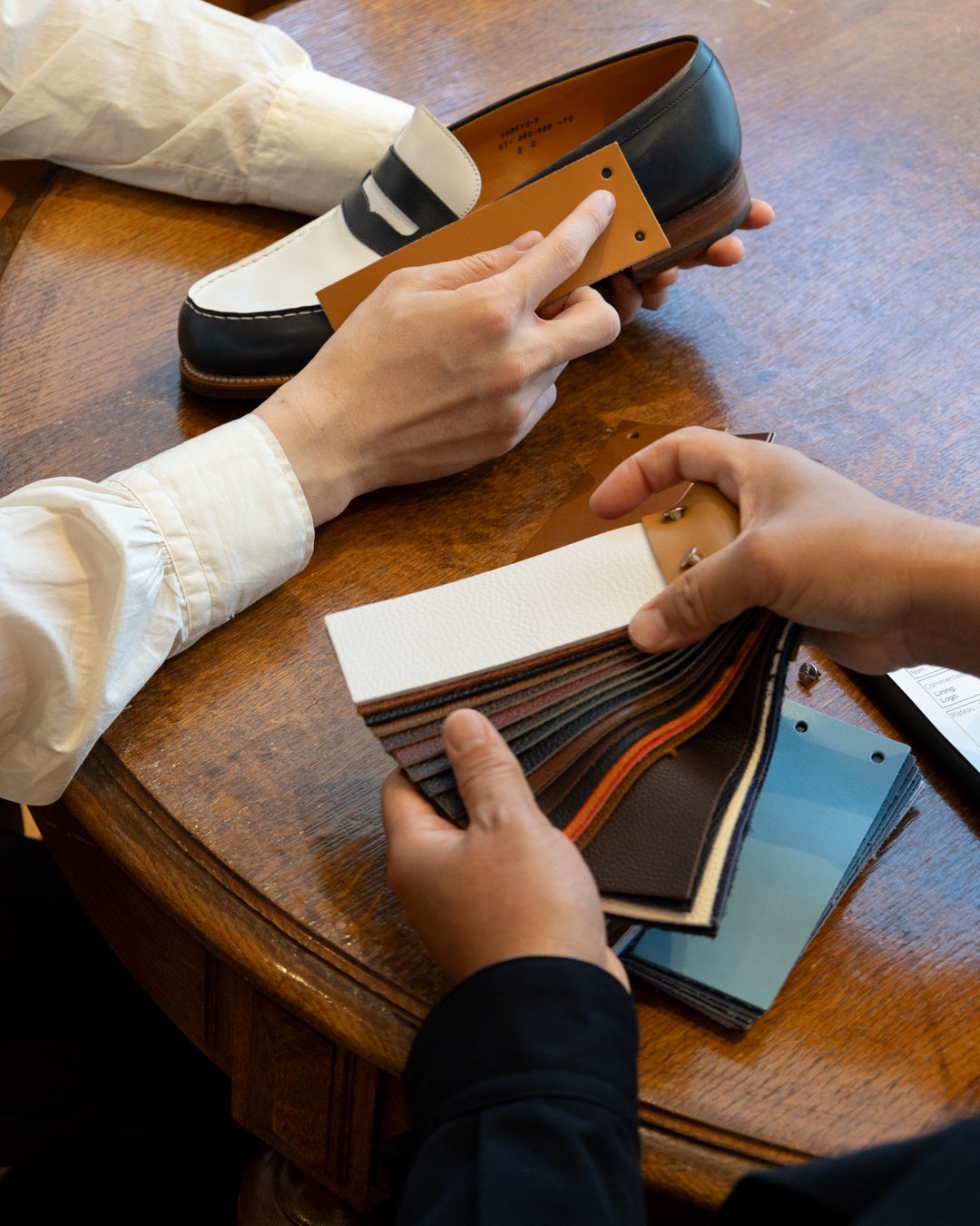 シューメーカーならではの豊富なレザーラインナップからお好みの色や素材をお選びいただき、メゾン エ ヴォヤージュ 麻布台ヒルズ店で展開している、#180 シグネチャーローファー、#300 キャップトゥー オックスフォード、#641ゴルフ ダービー、#690 4×4 ヨット ダービー、#705 サイドゴアブーツの全5型の中からオーダーを承るカスタムサービスです。