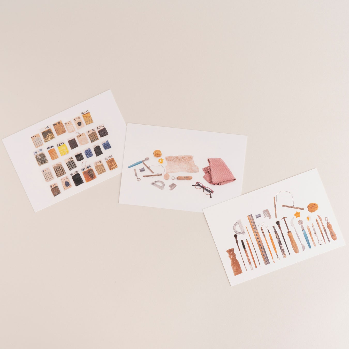 展覧会グッズの定番、ポストカード。今回の展示で初公開となるリサのスケッチを用いたデザインや、ミアが生まれるまでの制作プロセスをたどるデザイン、そして展示のキーとなる「リサの道具」をモチーフにしたものまで揃いました。定番の陶器作品のポストカードもご用意しています。