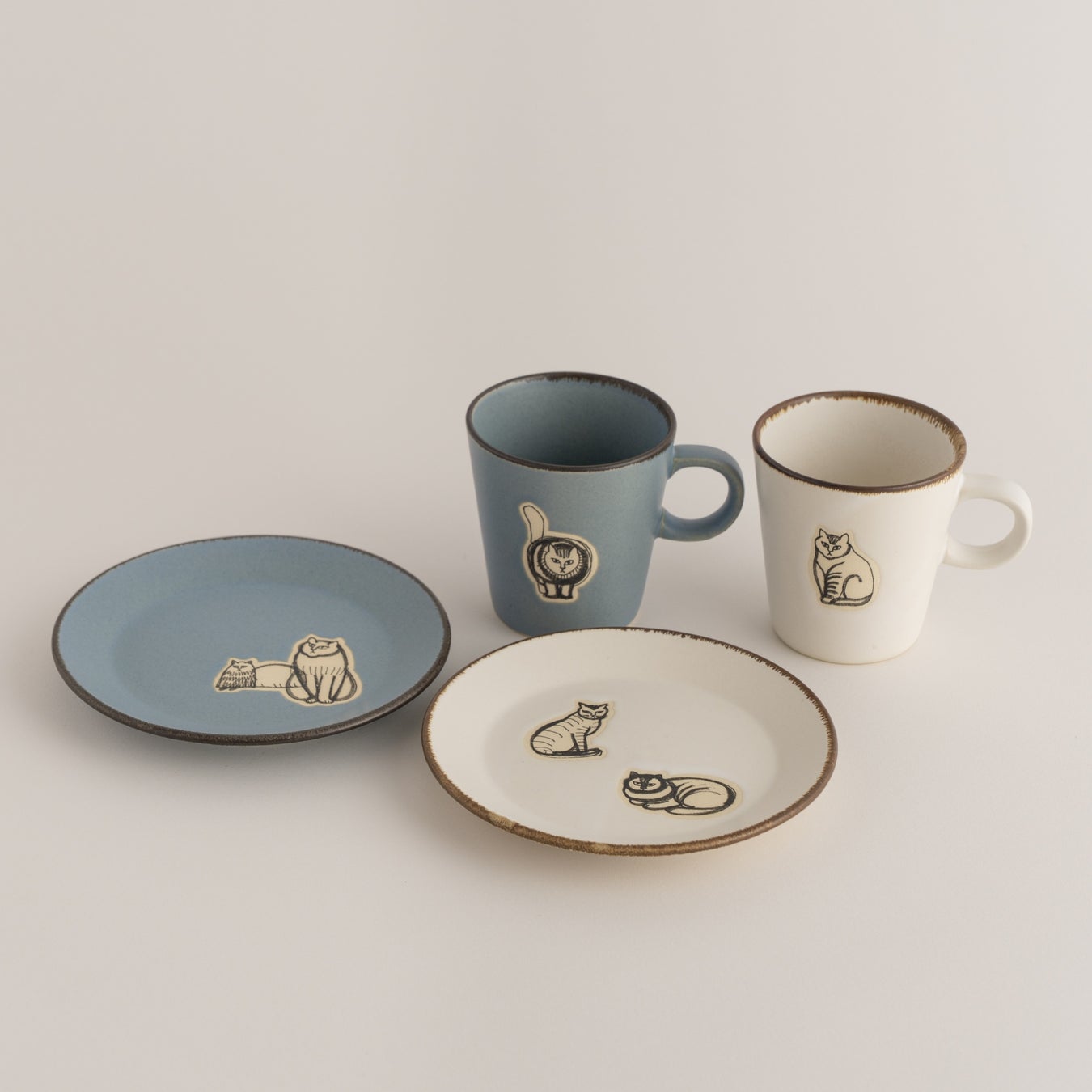 益子焼でつくられた、カップとプレートのセット。マットな釉薬の質感に、スケッチねこの部分のみ撥水加工を施しました。シンプルな佇まいの中に、さりげない愛らしさが感じられるデザインです。プレートはソーサーとしてもお使いいただけます。