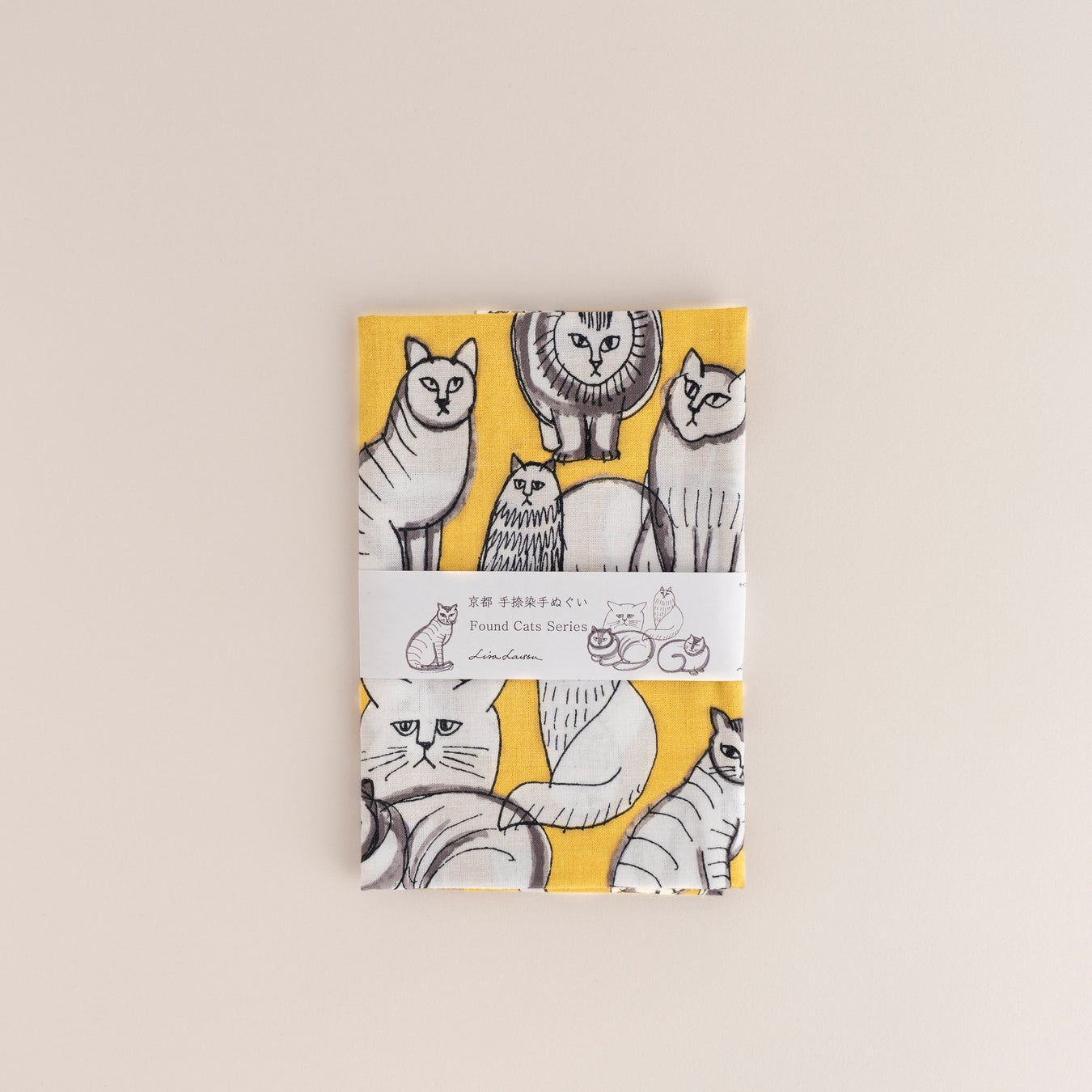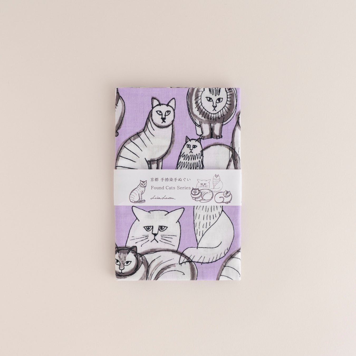 「Found Cats Series」が、捺染てぬぐいになりました。カラーは紫と黄色の全2色。新しく出会う、さまざまな猫たちをお楽しみください。