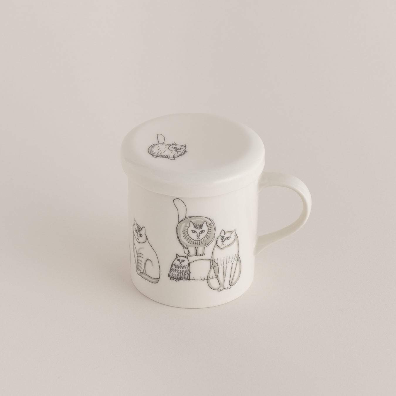 スケッチねこが描かれた、美濃焼のマグカップ。白を基調としたシンプルなデザインで、ふたの部分にもねこのモチーフがあしらわれています。ふたは裏返して、豆皿のようにお使いいただけます。