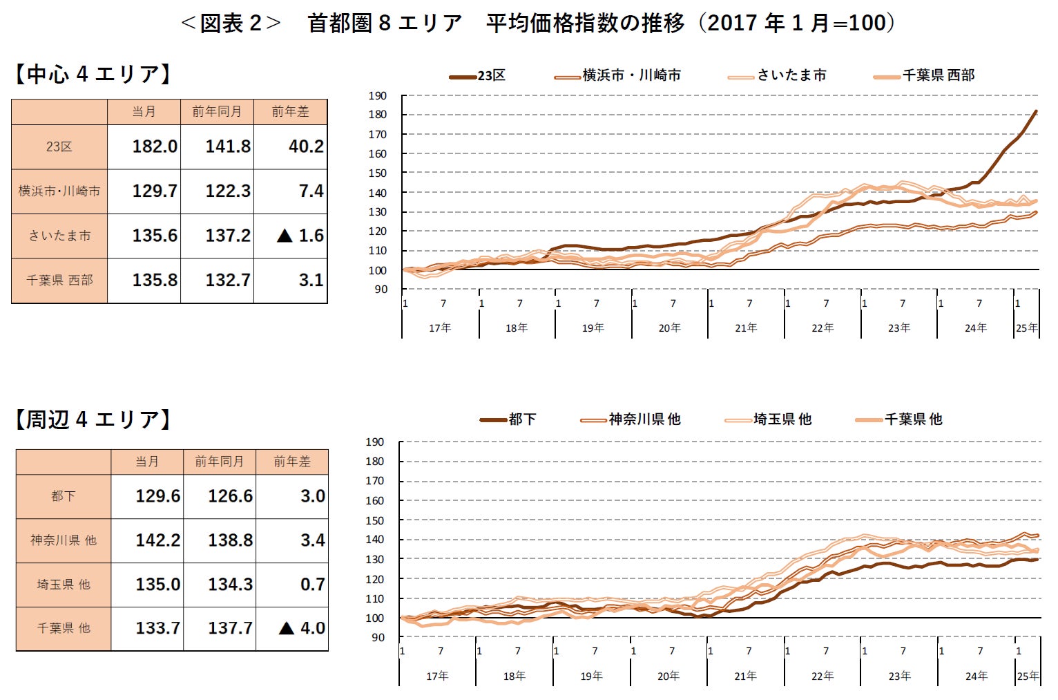 なお、東京23区、横浜市・川崎市の2エリアは2017年1月以降最高額を更新した。中でも東京23区は2024年8月以降前月比が高水準で推移し、9カ月連続で過去最高額を更新。価格指数の前年差は40.2となった。