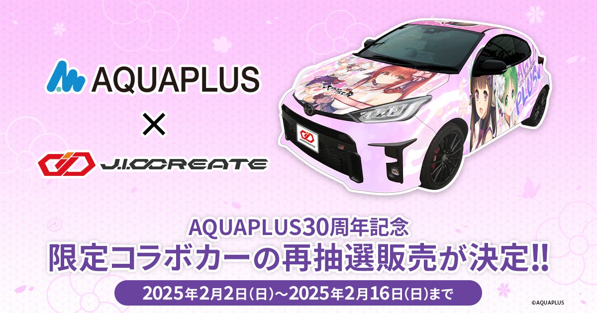 株式会社HIKE(本社:東京都新宿区、代表:三上 政高、以下「HIKE」)は、アクアプラス30周年記念で制作されたものコラボカー「GRヤリス」(制作・販売:じおくりえいと)のキャンセル分再抽選販売受付を2025年2月2日(日)10:00より開始いたします。販売台数は1台限定となっておりますので、この機会にぜひお申し込みください。