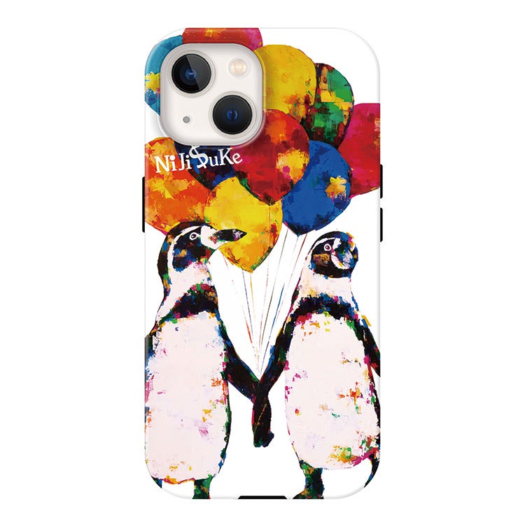 仲良く手をつないだペンギンとカラフルな風船が一緒に描かれたケース。