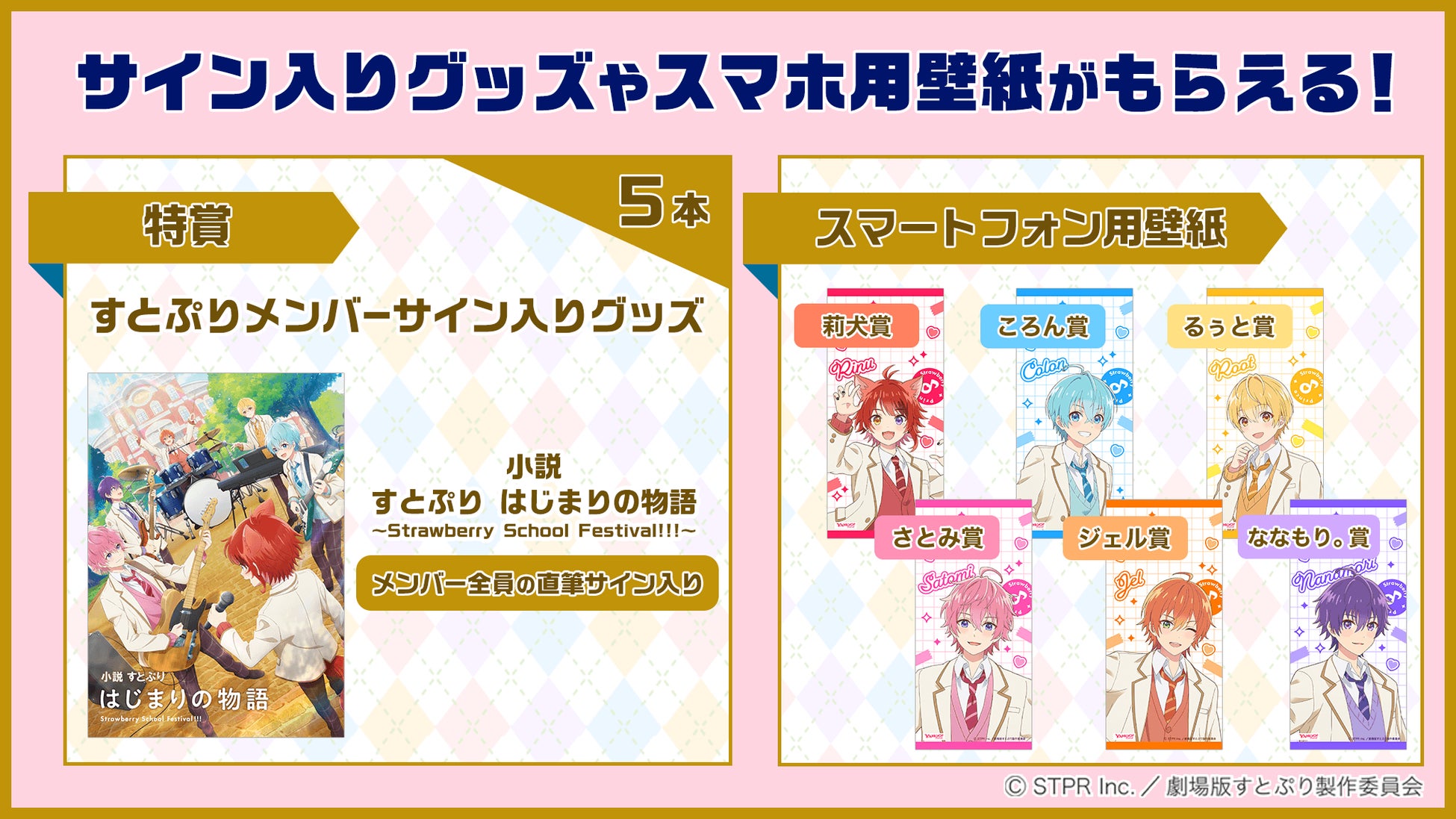 本映画の公開を記念し、「Yahoo! JAPAN」の特設ページでは、「すとぷり」メンバーからの限定メッセージ動画を公開するほか、メンバー直筆サイン入り「小説 すとぷり はじまりの物語~Strawberry School Festival!!!~」などが当たる「『劇場版すとぷり』スタンプラリー」(※1)を開催します。さらに、「Yahoo!検索」では検索結果画面上の特別演出や、特定のキーワードを検索することで挑戦できる「すとぷりクイズ」など、『劇場版すとぷり はじまりの物語~Strawberry School Festival!!!~』をより楽しめるスペシャルコンテンツ(※2)を提供します。