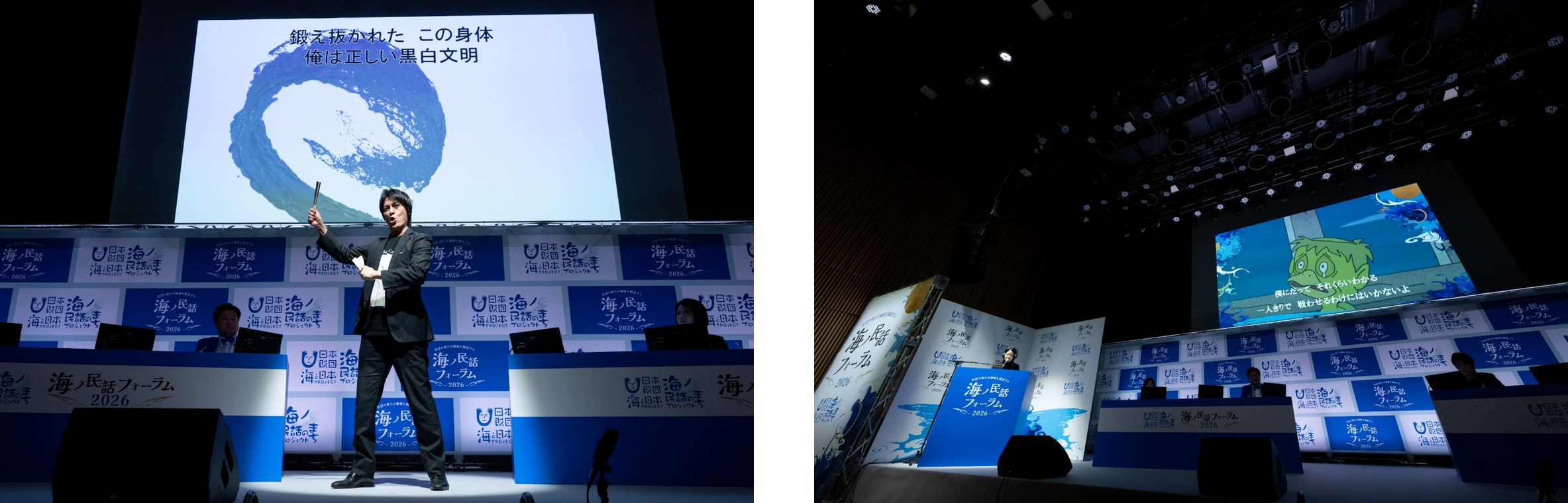 「海ノ民話」をテーマに、異ジャンルのアーティストが共演。オペラグループ「Trio99(トリオツーナイン)」は、アニメ「くじらの夫婦」を題材に、力強い歌声で物語の情緒を表現しました。続いて、現代の語り部としてラッパーの眞魚氏が登場。アニメ「河童の恩返し」のリリック(歌詞)を刻む斬新なパフォーマンスを披露し、民話が持つ現代的なエンターテインメントとしての可能性を示しました。