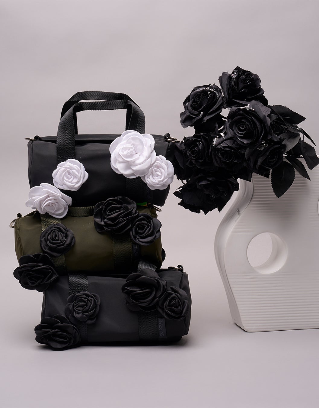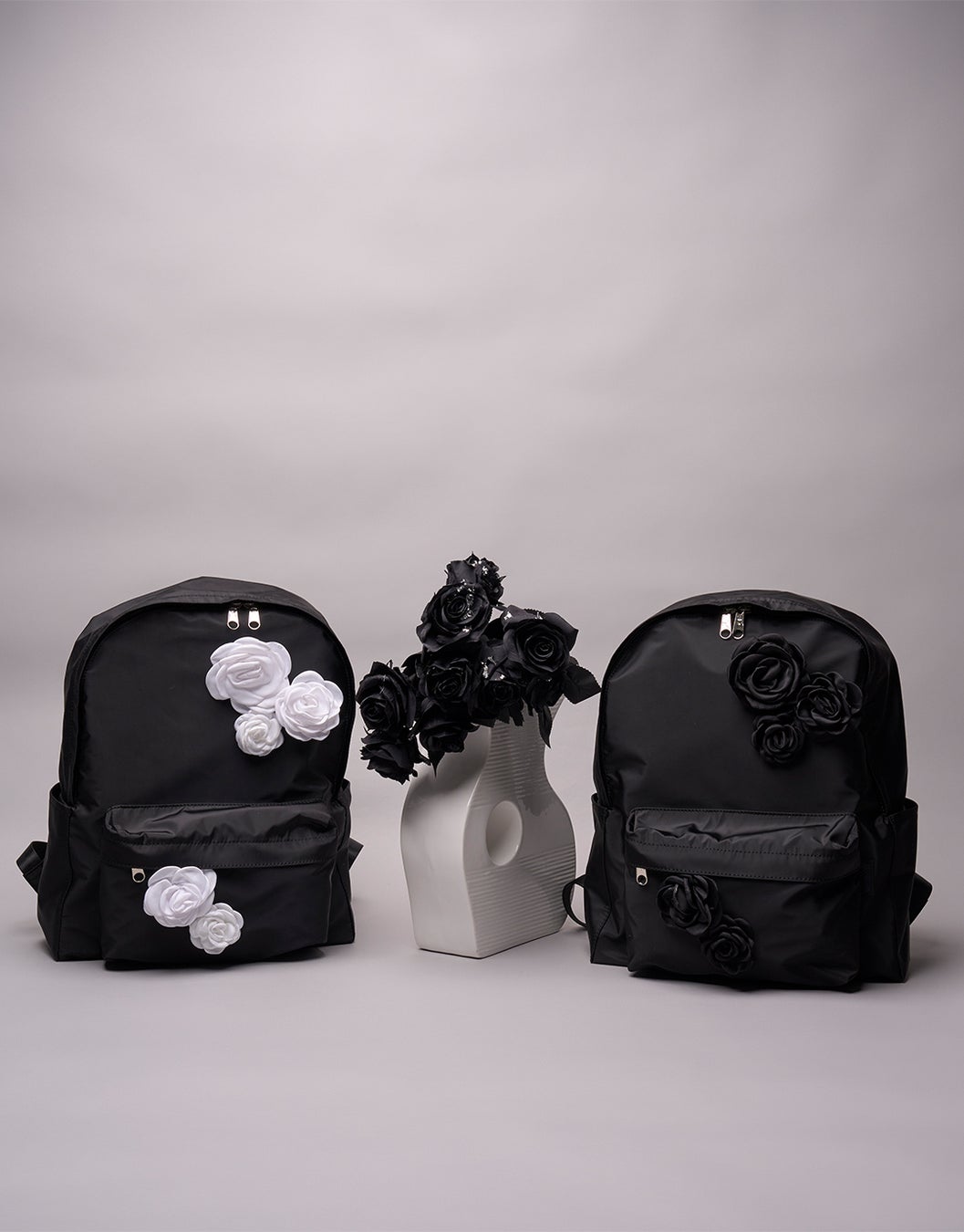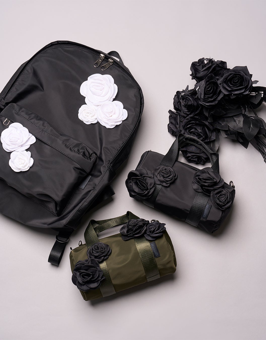 バッグパックは、本体がブラックにブラックローズまたはホワイトローズがあしらわれた全2色展開です。ボストンバッグは、バックパックと同様のカラー展開に加え、本体がオリーブカラーにブラックローズの全3色展開です。