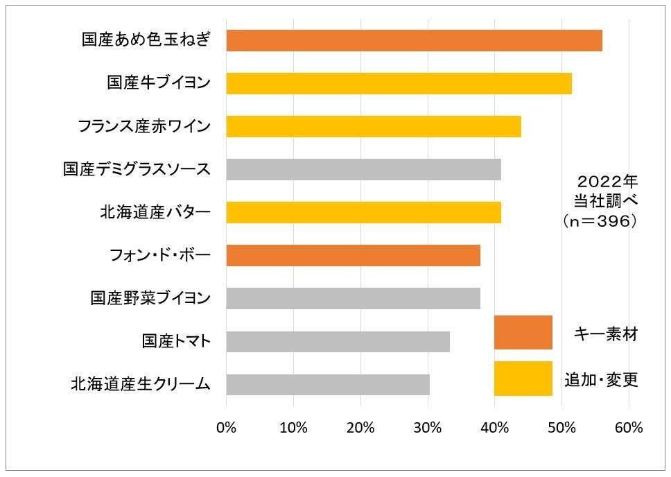 〇欧風カレーに使用し高級感を感じる素材 2022年当社調べ(n=396)