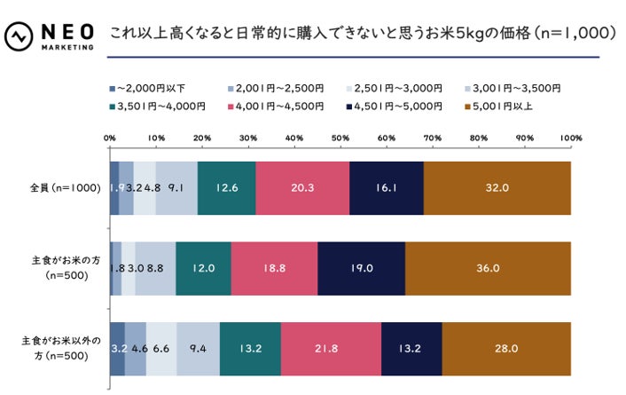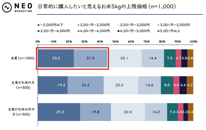 お米5kgの「日常的に購入したい上限価格」として最も多かったのは、主食がお米の方で「2,001円〜2,500円」(23.2%)、主食がお米以外の方で「〜2,000円以下」(23.2%)でした。