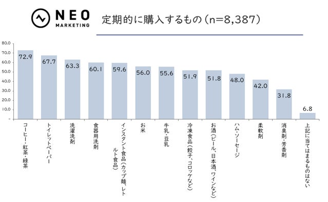 はじめにスクリーニング回答者全体に対し、定期的に購入するものについてお聞きしました。