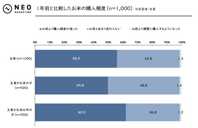 「1年前と比較してお米の購入頻度が減った」と回答した人が全体の55.9%に上り、過半数が購入頻度を下げていることが明らかに。特に、「主食がお米以外の方」においてはその傾向が顕著で、62.0%が購入頻度の減少を回答しています。