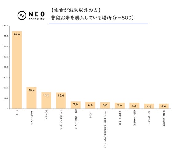 主食がお米の方は「スーパー」が74.0%、主食がお米以外の方も「スーパー」が74.6%で