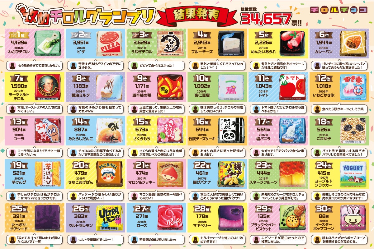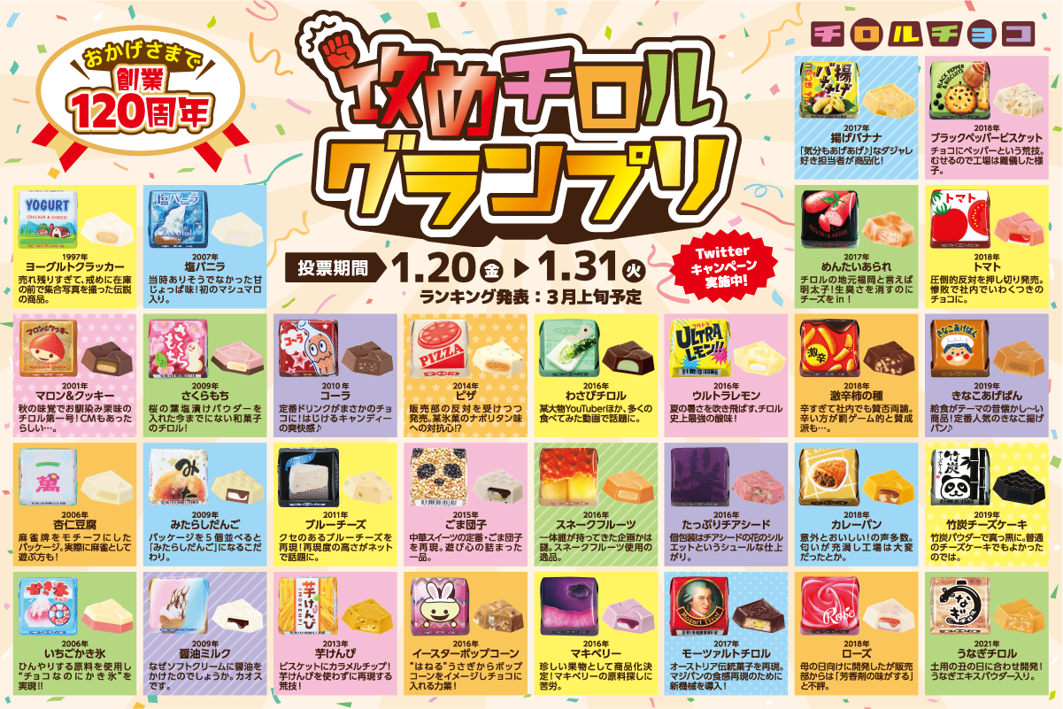 2023年1月20日(金)~31日(火)の期間、チロルチョコの公式Twitterで実施しました。これまで発売した約500種の中からチロル社員が厳選した30種を対象に、全国のチロルファンの投票によって「一番“攻めている”チロルチョコ」が決定いたしました。