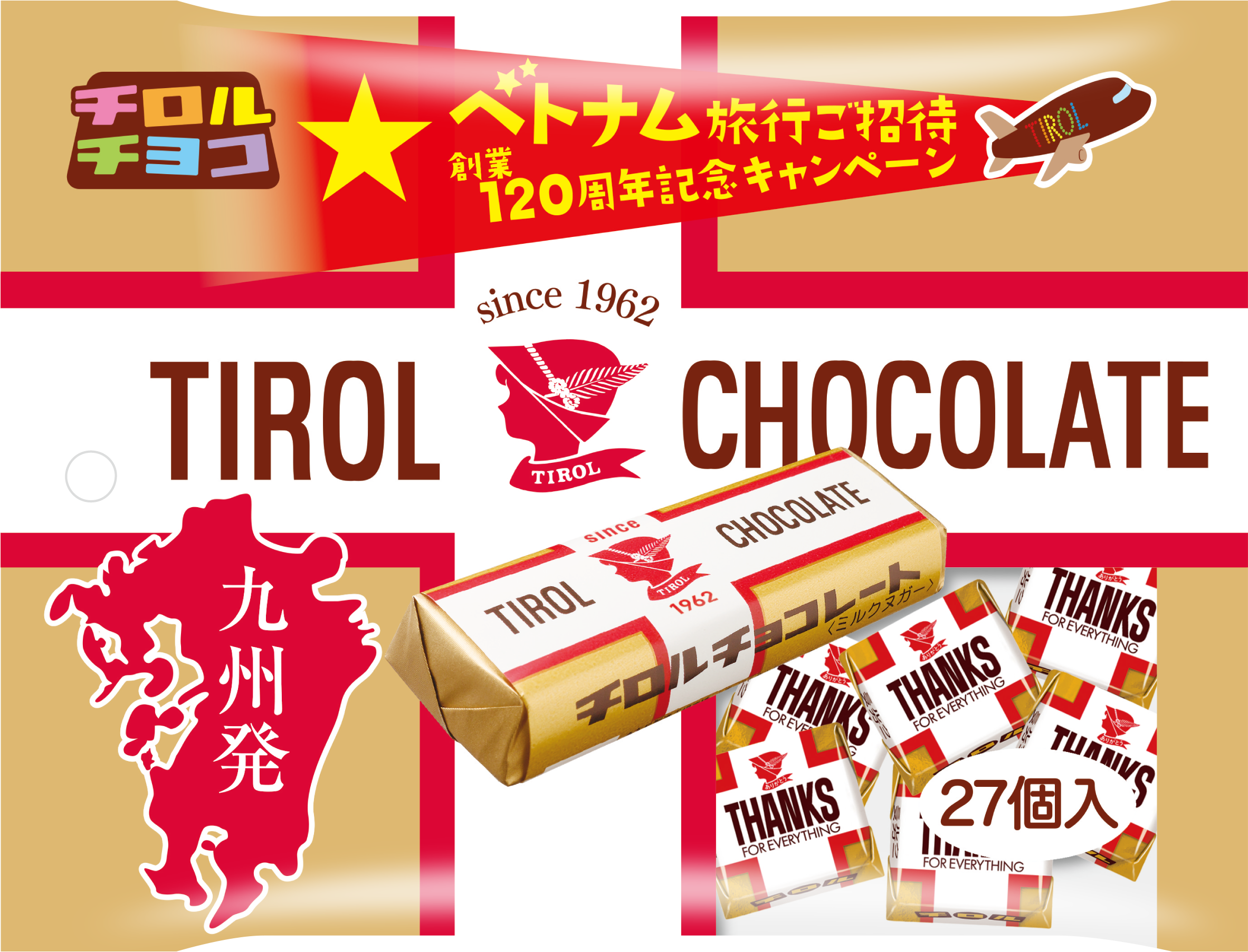 120周年、そしてチロルチョコベトナム工場の竣工を記念し、60組120名様にベトナム旅行が当たるキャンペンーンも発表されました。キャンペーンには、チロルチョコ120周年の特設サイトから誰でも応募が可能です。