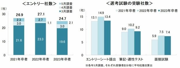 ○一人あたりのエントリー社数の平均は24.7社。前年同期調査(27.1社)を約2社下回りました