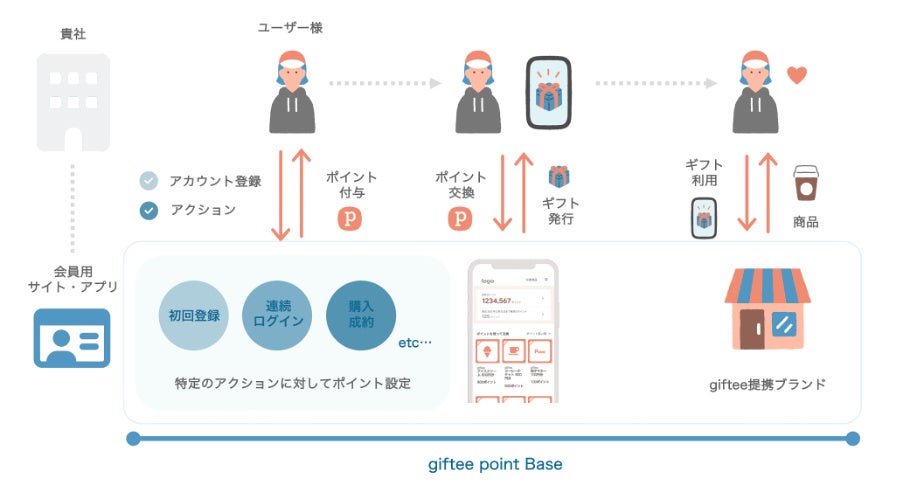 「giftee Point Base」は、ポイントの付与・管理からデジタルギフトとの交換までワンストップで実現可能なポイントプログラム基盤です。従来、企業がポイントプログラムを導入する場合、システム開発に多くの費用と期間を要することがハードルとなり導入に踏み切れないケースや、従来の汎用的なシステムではカスタマイズが充分にできないという課題がありました。また、ポイント交換の対象となるギフトを常時豊富に揃えることができず、魅力あるポイントプログラムの運用維持が難しいという課題も見受けられます。ギフティでは、企業のポイントプログラムに関する課題を解決すべく、「giftee for Business」(※2)の新たなソリューションとして、2024年3月より「giftee Point Base」の提供を開始いたしました。「giftee Point Base」の導入により、企業は、最小限の開発費用と期間でポイントプログラムに必要なシステムの構築ができ、ポイントの付与・管理、貯まったポイントのデジタルギフトへの交換までシームレスに実現することが可能です。また、交換対象となるギフトとして、「giftee for Business」が提供する約1,000種類以上のデジタルギフトをご利用いただけます。顧客のロイヤリティを高める施策や新規サービスのリリースタイミングなど、幅広い業界で多様な用途に活用いただけます。