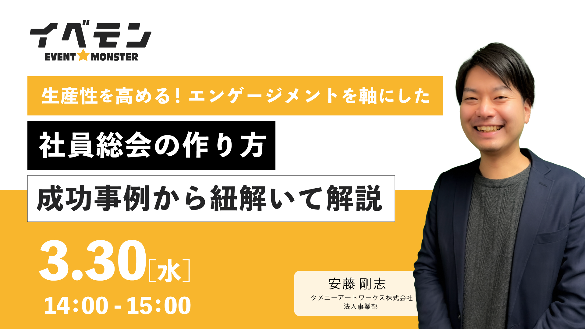 タメニー株式会社(本社:東京都品川区、代表取締役社長:佐藤茂、証券コード:東証マザーズ6181)のグループ会社であるタメニーアートワークス株式会社(代表取締役社長:福井秀幸)が運営する企業イベントプロデュース「イベモン(URL:https://evemon.jp/)」は、「生産性を高める!エンゲージメントを軸にした社員総会の作り方」をテーマとした無料ウェビナーを3月30日(水)に開催いたしますのでお知らせいたします。