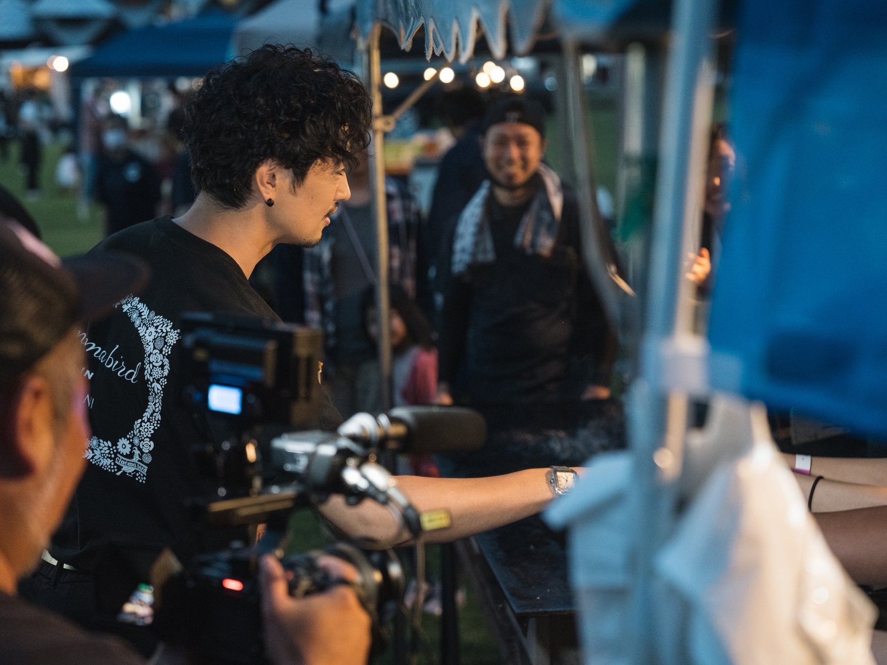 cinéma bird といえば、映画上映に加え、アーティストライブとお笑いライブがあることも魅力の一つ。恒例のウェルカムソングは桜井まみと古賀小由実が担当。ウクレレの軽やかな音色と透明感ある歌声で来場者をお迎えしました。スペシャルゲストによるライブには一青窈が登場。米同時多発テロ(2001年)に着想を得て自ら作詞されたことで知られている自身の代表曲「ハナミズキ」とデビュー曲「もらい泣き」を熱唱。圧巻の歌声で来場者を一気に引き込みました。ライブの途中には客席に降り立ち、来場者と一体化となりパフォーマンス。ファンサービス全開のステージに、来場者は歓喜に包まれました。さらに、バンドメンバーは、齊藤工率いるcinéma birds(豪起、古賀小由実、齊藤工)が担当。齊藤工が奏でるアコースティックギターによる歌唱もcinéma birdならではのもの。齊藤工は「一青さんは3回出演していただいている。実は今回、いろいろな事態があり・・・急遽駆けつけてくれた救世主なんです。また、(3年前に実施した)ドライブインシアターの時も、コロナ禍でお客さんとの距離を取らなければいけなかった。でも、今回みたいに一青さんが客席を練り歩いてくれて。いつも一青窈さんが人を繋いでくれるんです。」とコメントしました。一青窈は「呼んでいただき、この地にこれて感謝してます。(前に出演していた)皆さんが場を温めててくれたので、とても歌いやすかったです。」と続けました。その後も、cinéma birdsによるライブが続き、夕暮れに差し掛かった会場は、cinéma birdらしい優しい空気に包まれました。