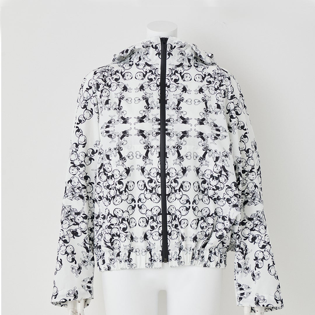 アートは2022年秋冬からの継続の”Olive“のモノトーン柄をプリント。ファンの風を取り込むとふわりと膨らみ、空調服®ならではのバルーンシルエットになります。夏に着用しても涼しげに見えるスポーティエレガントなフーディデザイン。フードの周囲や袖口のゴムスピンドルをアジャストして変化を付け、お好みのシルエットで着用いただけます。
