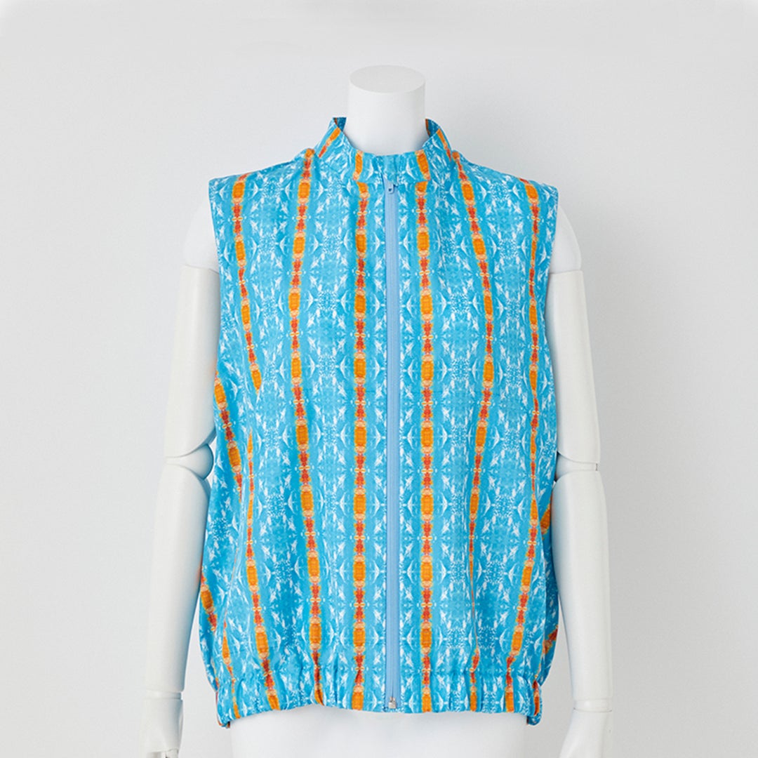 アートは”vacation“をプリント。夏にぴったりのカラーで、Tシャツの上に着用しても涼しげに見えるスポーティエレガントなウエストコートに仕上げました。スタンドカラー上端にファスナー先の引手を隠すタブデザインがあり、より美しいシルエットに。