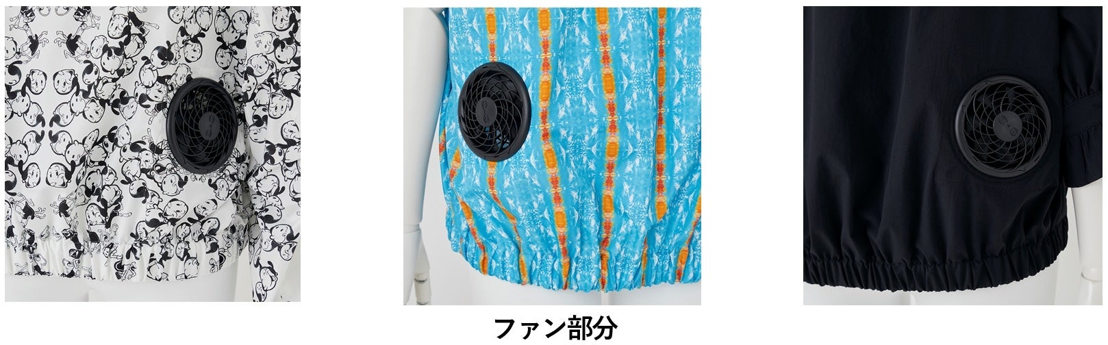 「ヤンチェ_オンテンバール」2023Collectionのために香取慎吾さんが制作したアートは “SINGIN'IN THE RAIN” と”vacation“(※アートについてはこちら https://j-o.tokyo/news.html )。今シーズンは“SINGIN'IN THE RAIN”を裏地メッシュ部分にプリントしたパフスリーブコートや、”vacation“を全面にパネルプリントしたウエストコートなど計3型を企画・製作。気候変動を意識し、暑い夏でも快適に涼しく過ごせる「空調服®」を取り入れた初の3社コラボ商品です。「空調服®」とは2個のファンから服の中に外気を取り込み、汗の気化熱で身体を冷やすことができる製品です。作業着の枠を超え、アウトドアだけでなくさまざまなシーンでの着こなしに合うエレガントなコートに仕上げており、いずれもコート専業54年になる当社自社工場「サンヨーソーイング 青森ファクトリー」で生産しています。