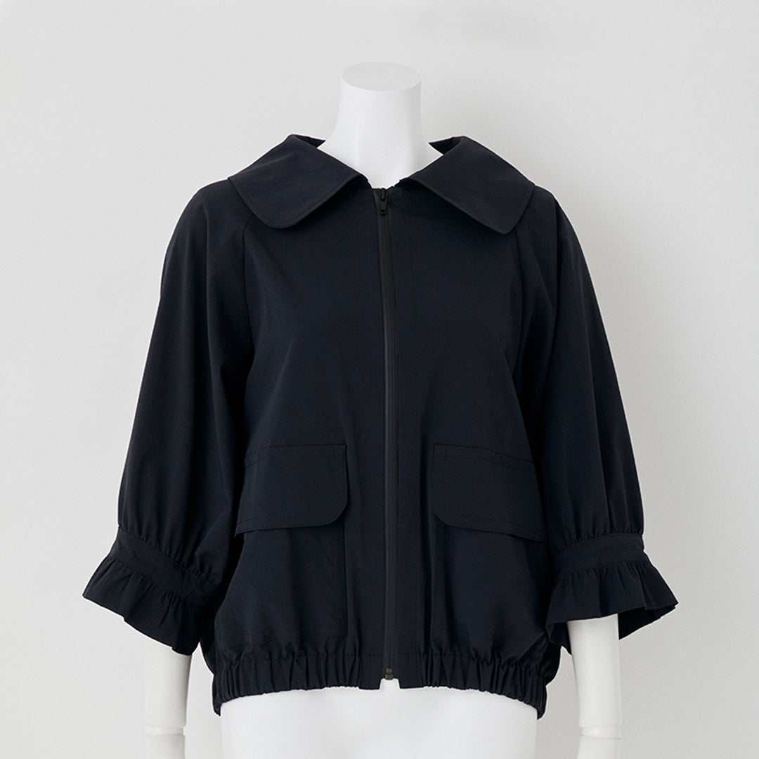 アートは “SINGIN'IN THE RAIN”を裏地メッシュ部分にプリント。パフスリーブの7分袖丈で、大きめの襟が印象的なエレガントコートに仕上げました。