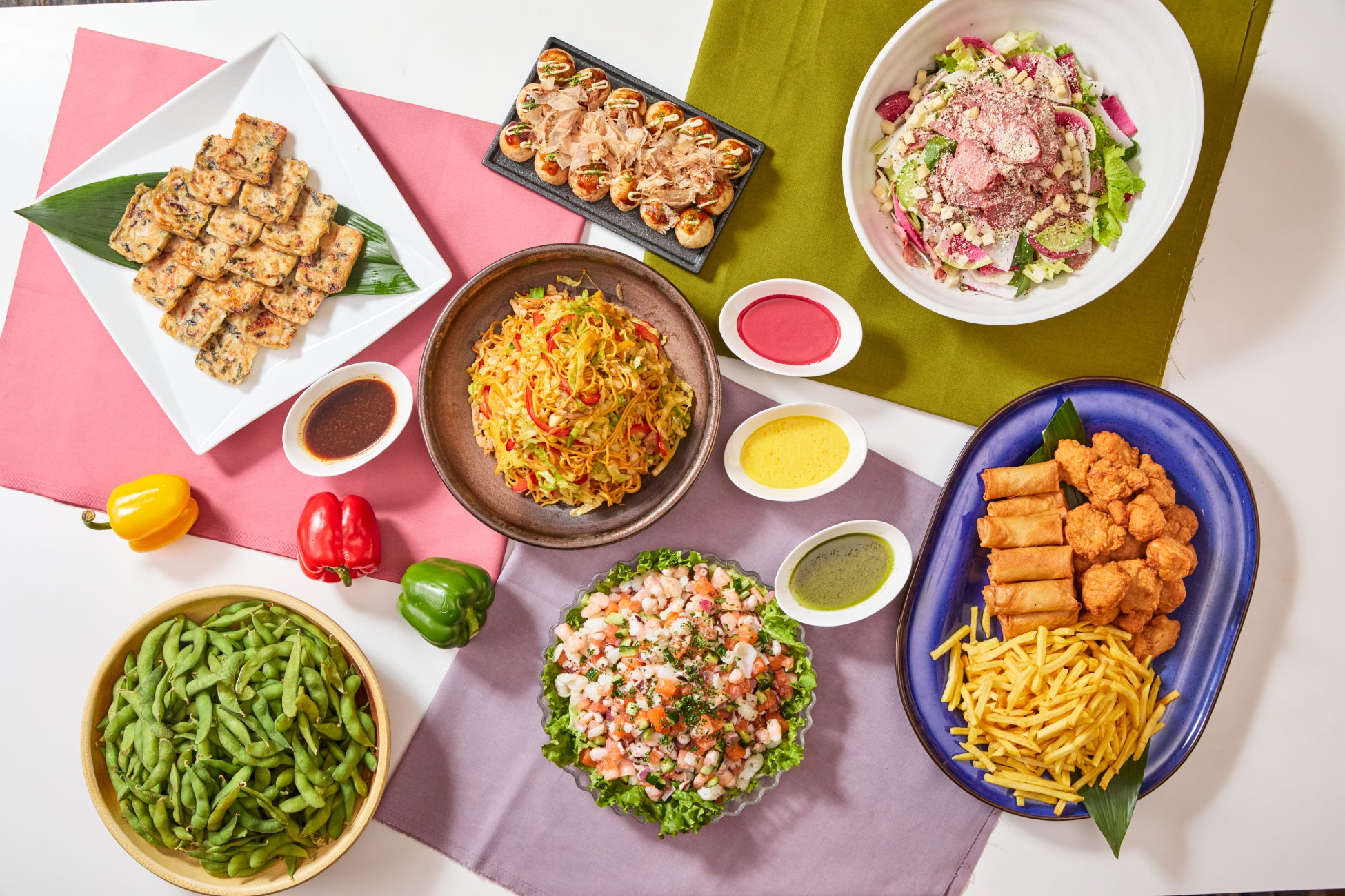 シーフードマリネ サルピコン風/アゴーラ風 彩大根とコンタンのウィンザーサラダ/チャウミン風焼きそば/たこ焼き/海鮮チヂミ XO醤ソース/ミニ春巻き