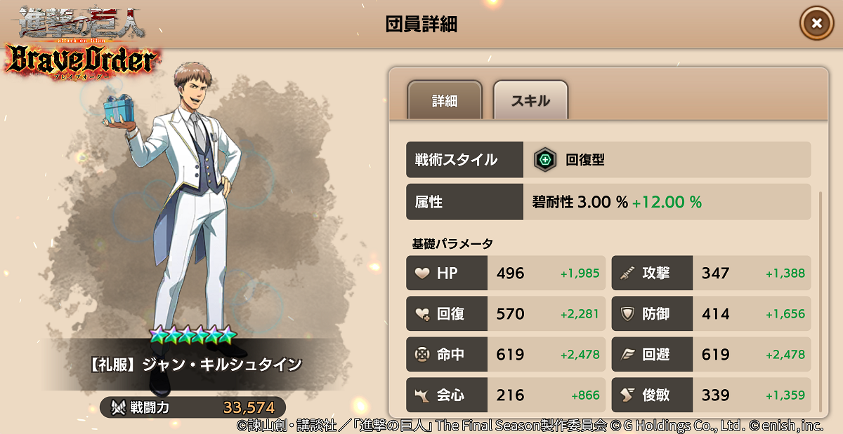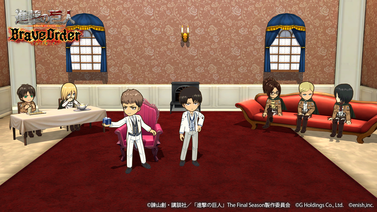 株式会社enish(本社:東京都港区、代表取締役社長:安徳 孝平、以下enish)は、アニメ『進撃の巨人』のスマートフォンゲーム最新作「進撃の巨人Brave Order」にて、「礼装をまとう兵士たち」イベントを開催いたします。プレゼントを集めてルーレットにチャレンジ!豪華報酬を手に入れよう!イベント期間中はお好きな★4キャラが最大3体もらえる「ログインキャンペーン」も実施中!また「礼装をまとう兵士たちガチャ」では「【礼服】リヴァイ」と「【礼服】ジャン・キルシュタイン」が登場!その他、ブレオダ公式TwitterでオリジナルデジタルQUOカード500円が毎日その場で130名に当たる!?キャンペーンを実施いたします。最新情報は、ゲーム公式サイト・ゲーム公式Twitterアカウントにて随時公開して行きますので、ぜひご覧ください。