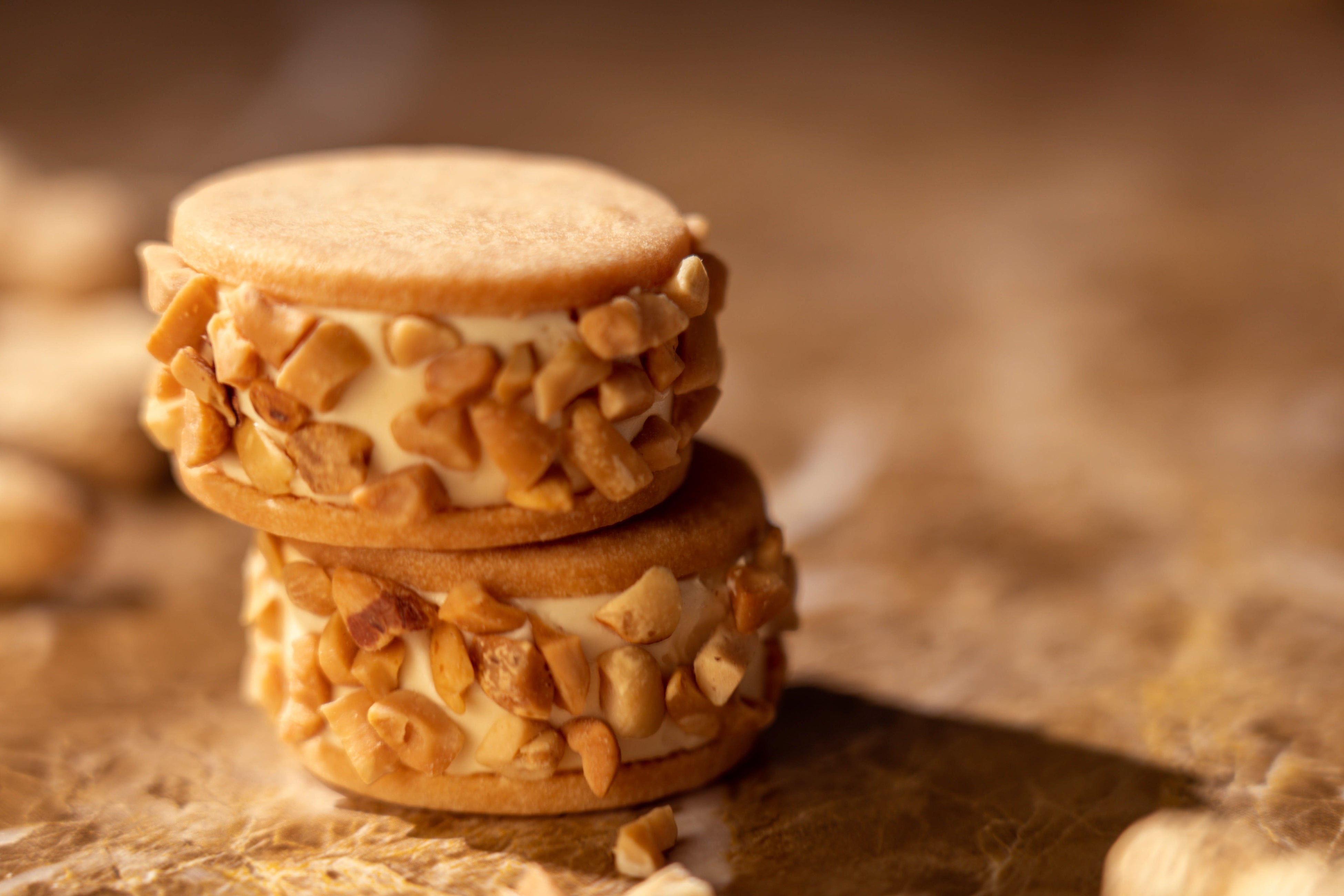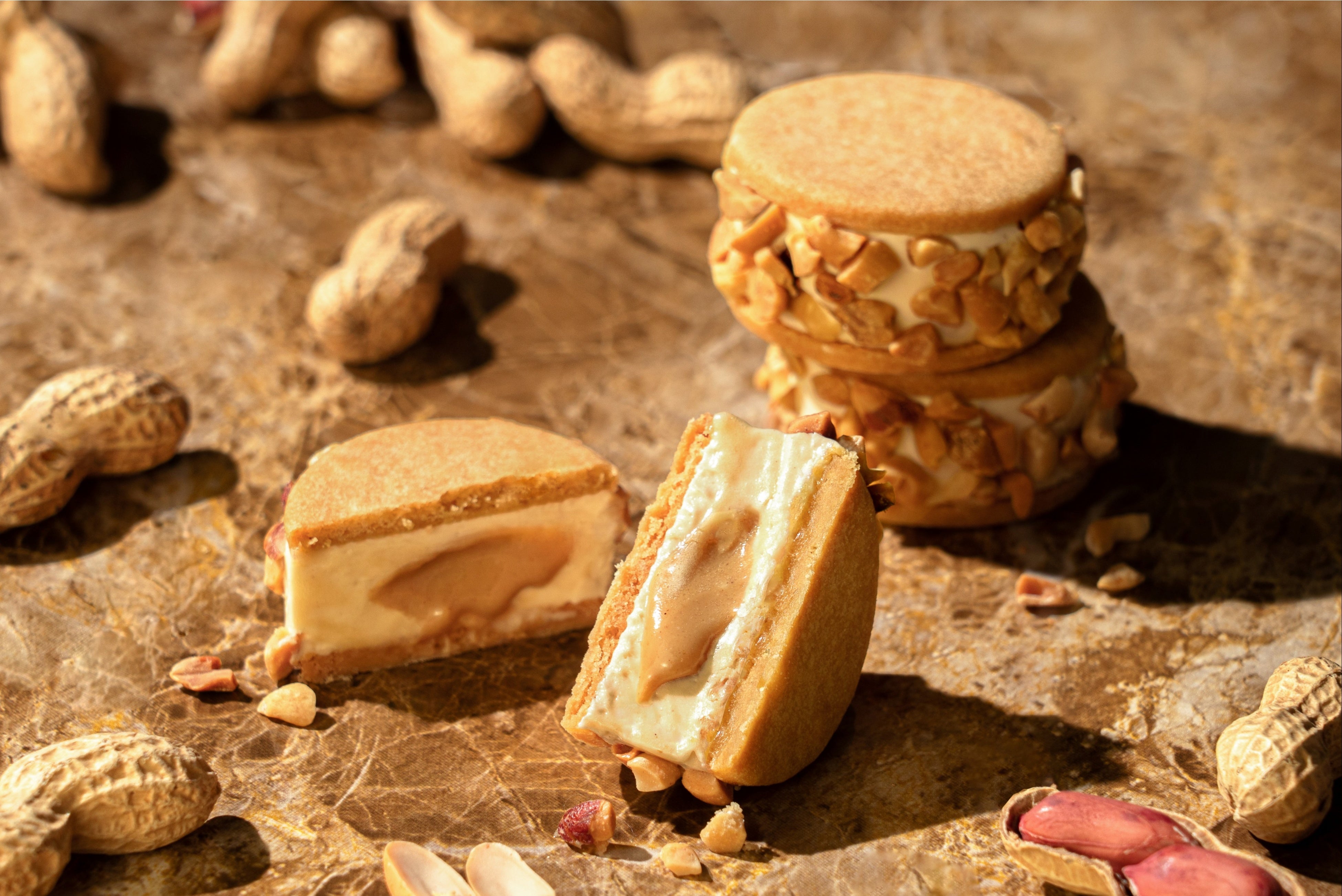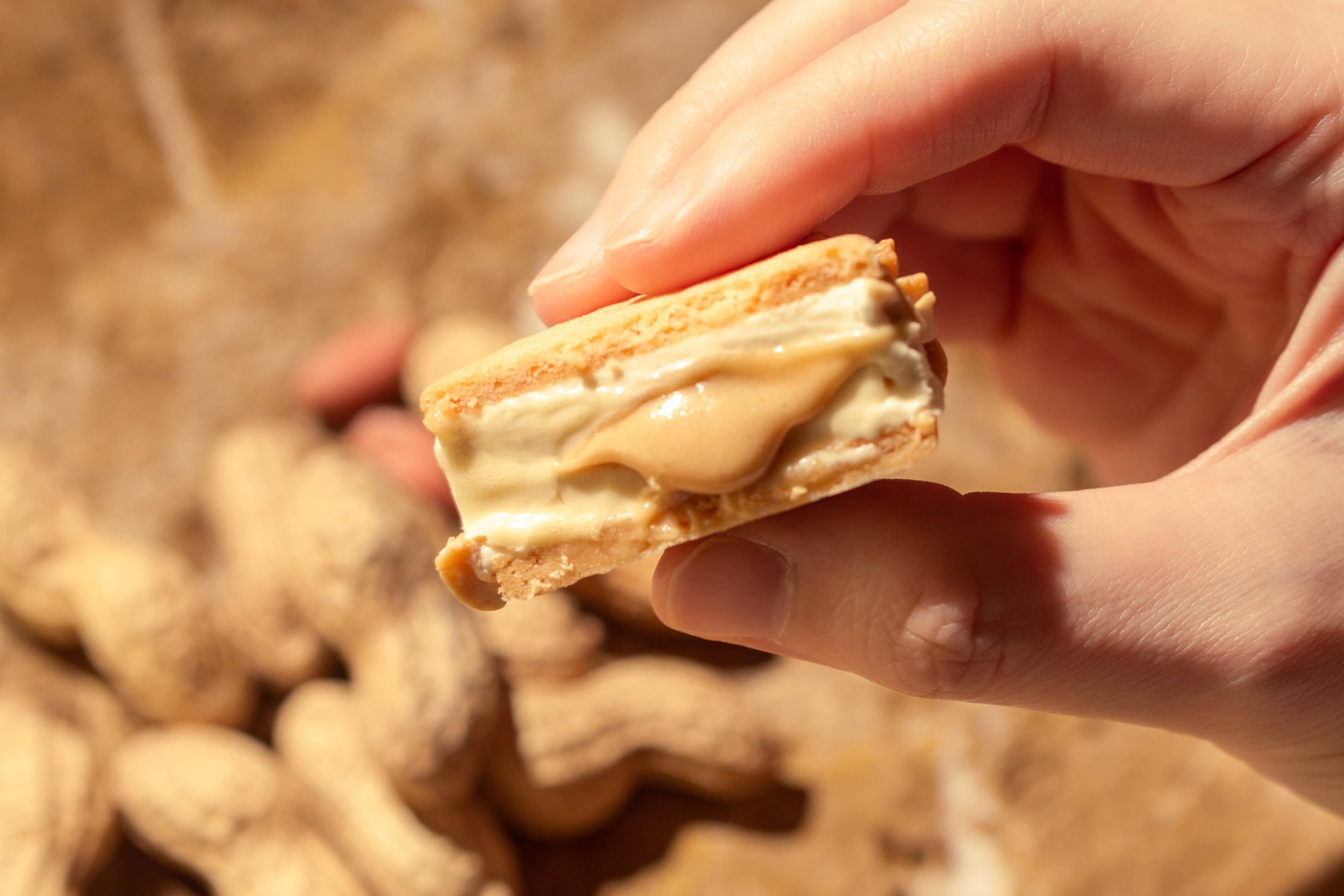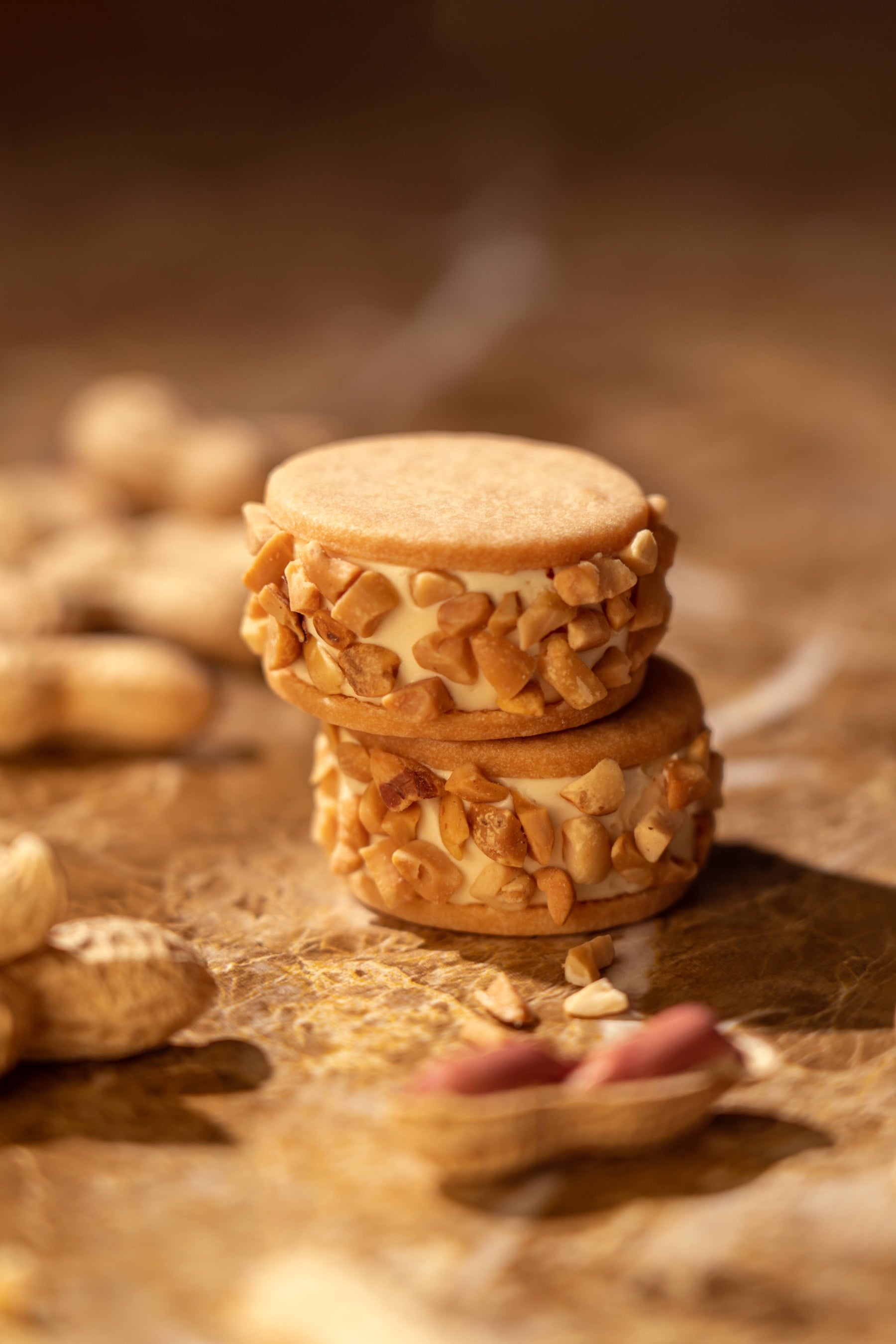 ピーナッツペーストと発酵バターを使用したなめらかなでコクのあるバタークリームに、ピーナッツクリームを閉じ込め、サクサクのクッキーで丁寧にサンドし、ピーナッツダイスをトッピング。