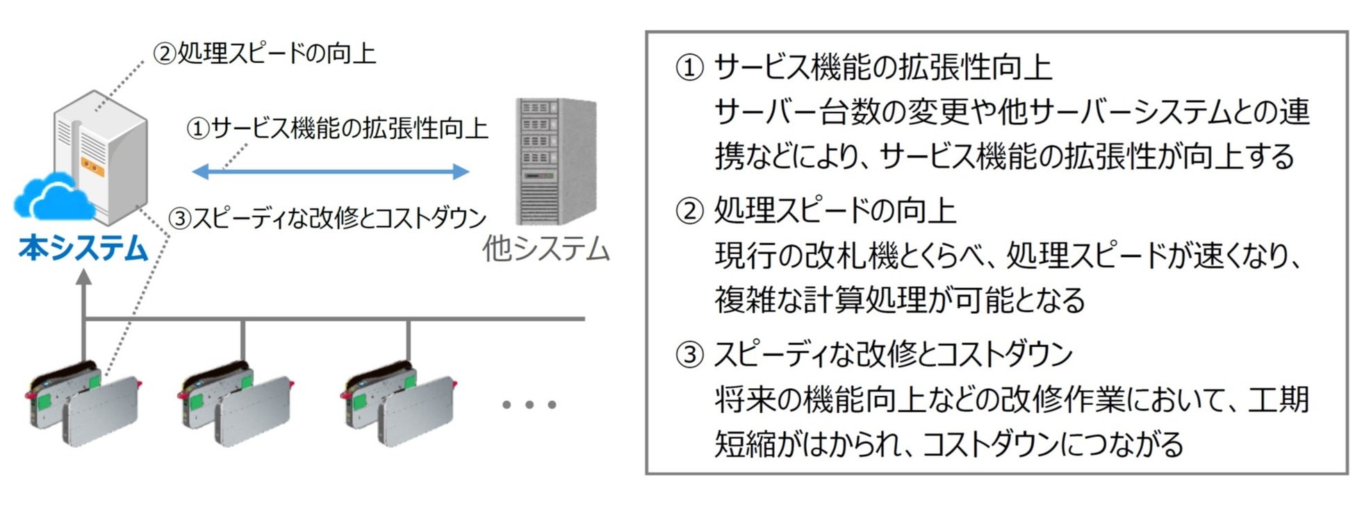 | 〇JR東日本では、2023年度から「センターサーバー方式」を採用した新しいSuica改札システム(以下「本システム※1」)を導入し、Suica共通基盤化を推進します。 〇本システム導入によりサービス機能の拡張性や処理スピードを向上し、多様化するニーズに対応した「新しいSuicaサービス」の提供を実現することにより、グループ経営ビジョン「変革2027」で目指すシームレスな移動と多様なサービスのワンストップ化を目指します。 |