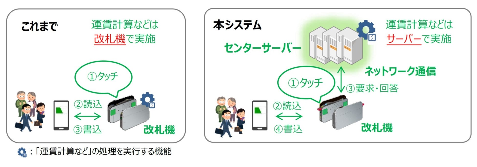運賃計算などの処理は全てセンターサーバーで実施します。なお、本システムを導入した改札機についてもSuicaのご利用方法は変わりません。