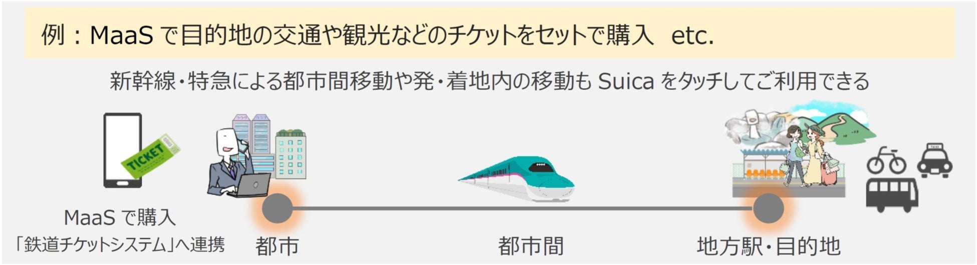 本システムや鉄道チケットシステム※3の導入を通じ、これまでのSuicaサービスを革新するプラットフォームを整備します。それにより、これまでのSuicaサービスに加えて「新しいSuicaサービス」の提供を可能とし、JR東日本グループをシームレスにご利用いただける「Suicaサービスの将来像」の実現を目指します。(ご利用イメージは次ページ参照)