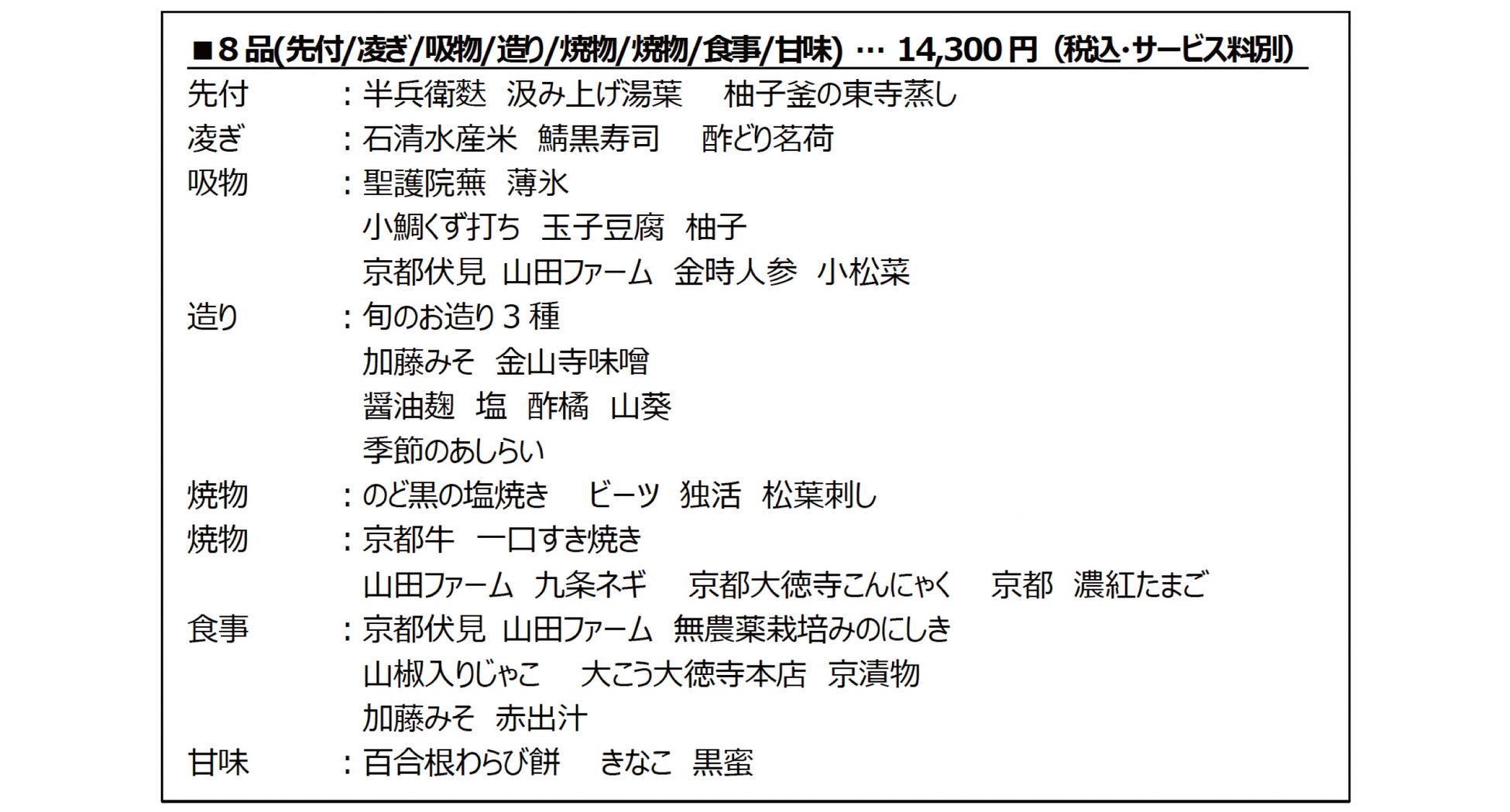 職人の技を間近に感じながら、味わい・香り・音・空気までも含めた五感で堪能する、東山ならではの上質な会席体験を心ゆくまでお過ごしください。