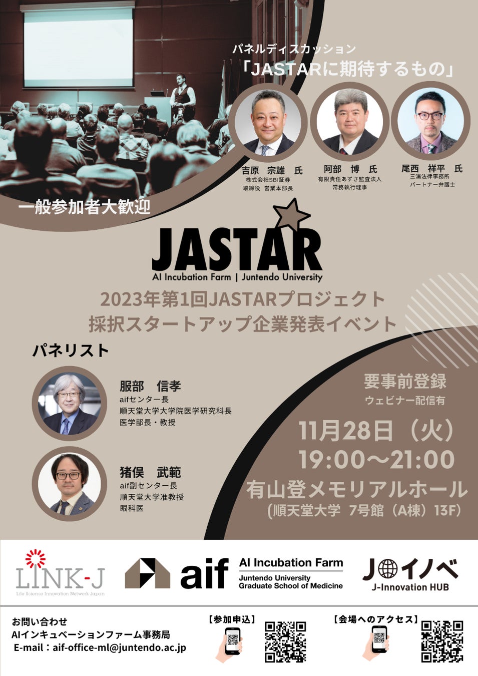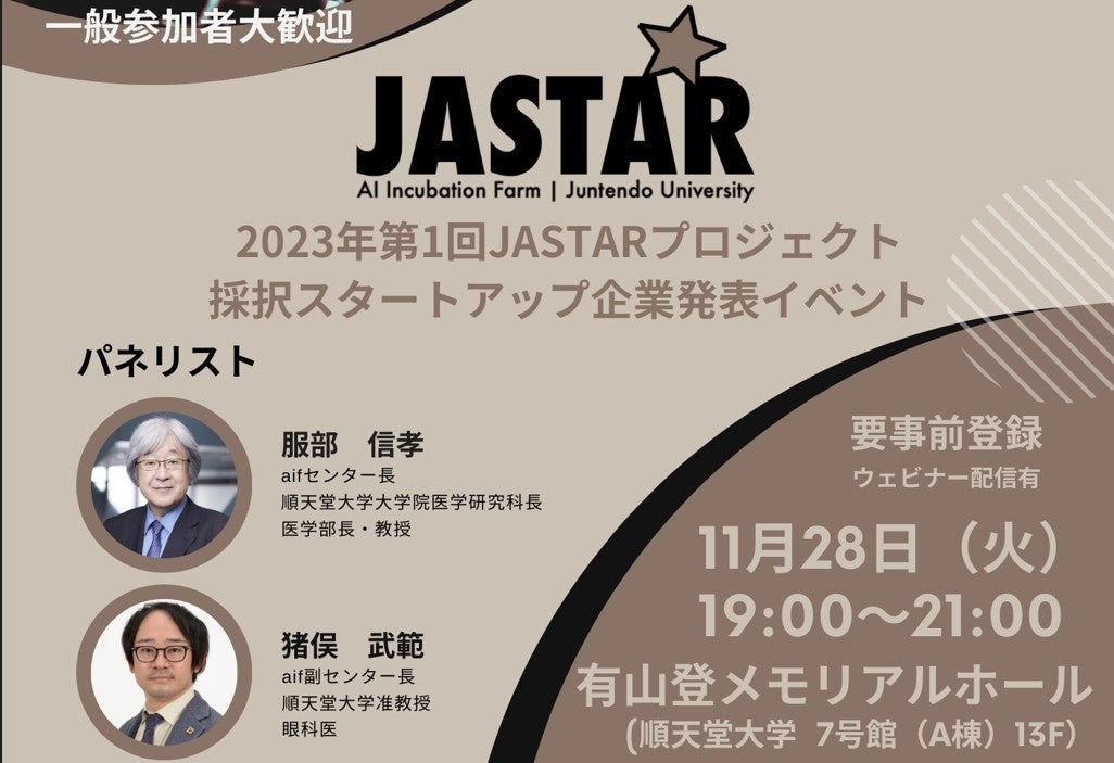 順天堂大学AIインキュベーションファーム主催 第1回JASTARプロジェクト採択スタートアップ企業発表イベント【2023年11月28日(火) 19:00~21:00】