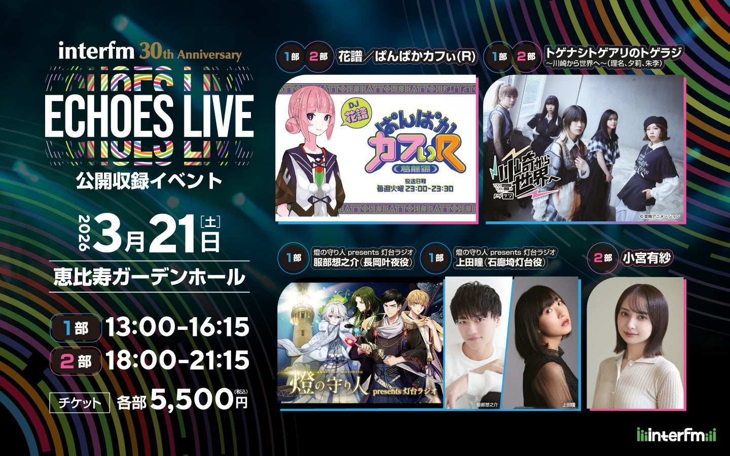 インターエフエム(東京:89.7MHz 横浜:76.5 MHz)は、2026年4月に開局30周年を迎えます。この周年記念イベントの第一弾として「interfm 30th Anniversary『ECHOES LIVE』 公開収録イベント」を2026年3月21日(土)に恵比寿ガーデンホールにて開催します。