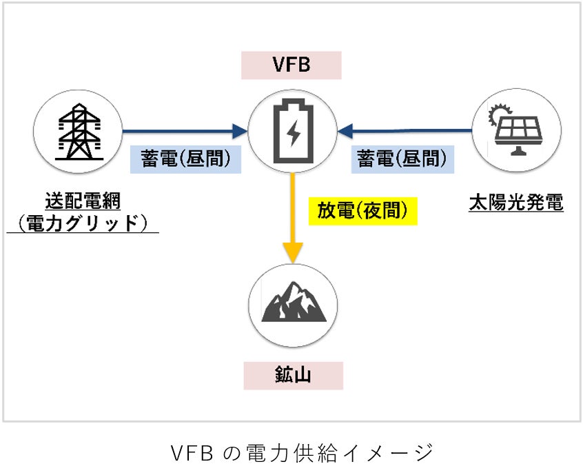 加えて、同鉱山内に豪州最大の蓄電容量となるVFBを他社に先駆けて導入します。蓄電容量は12.6MWh・出力2MWで約6時間にわたり、太陽光発電同様に鉱山内の電力需要をまかなえる規模です。昼間に発電した電力を蓄え、夜間にその電力を活用することで、夜間の化石燃料発電への依存を減らし、環境にやさしい鉱山運営を実現します。なお、VFBに使用されるバナジウム電解液は、出光デベラ(Idemitsu Debella Pty Ltd、当社出資100%の出光オーストラリア関係会社)が51%を出資するVecco(ヴェッコ)社(Vecco Group Pty Ltd、本社:ブリスベン)が製造・供給し、住友電気工業株式会社(本社:大阪府大阪市、代表取締役社長:井上治)がVFBを納入する予定です。