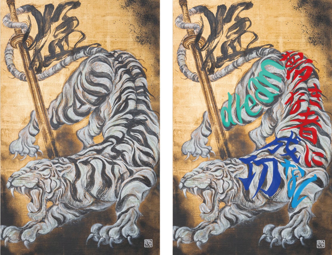タイトルの「CalligraphyBeast(書道の猛獣)」は、“書道によって書かれた猛獣”という意味と、“魂が猛獣になった”という両方の意味を持ちます。言葉に込められた“夢や挑戦に対する強い思い”に形を与えるには、強さを象徴する虎が良いと思いました。夢のために戦う意志を持っていることを示すため、またただの生き物ではなく言葉に宿った魂が具現化していることを表すために刀も描きました。