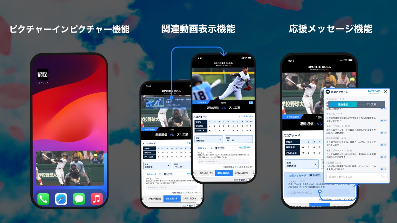 また、学生スポーツ応援コミュニティ「ANYTEAM RESPECT YOU, au(エニーチーム)」と連携することで、試合映像を観ながらリアルタイムに球児たちに応援メッセージを贈ることができ、ファン同士がつながることができます。